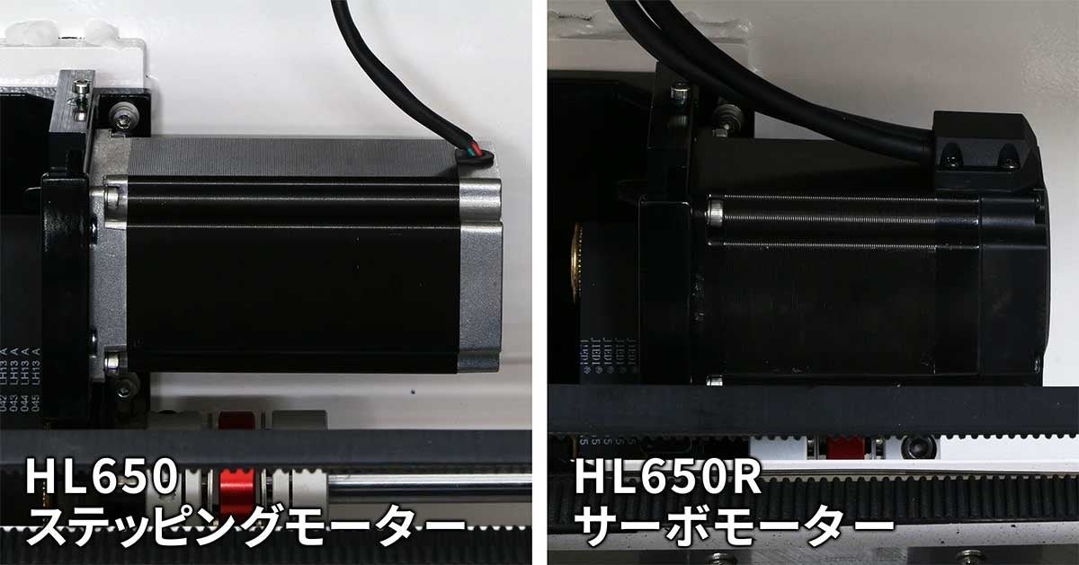 HL650とHL650RにはレーザーヘッドとX軸を動かしているモーターに違いがあり、HL650はステッピングモーター、HL650Rはサーボモーターというモーターを搭載しています。サーボモーターは細かな制御や高回転の運用が得意なため、より高速な加工が可能となります。