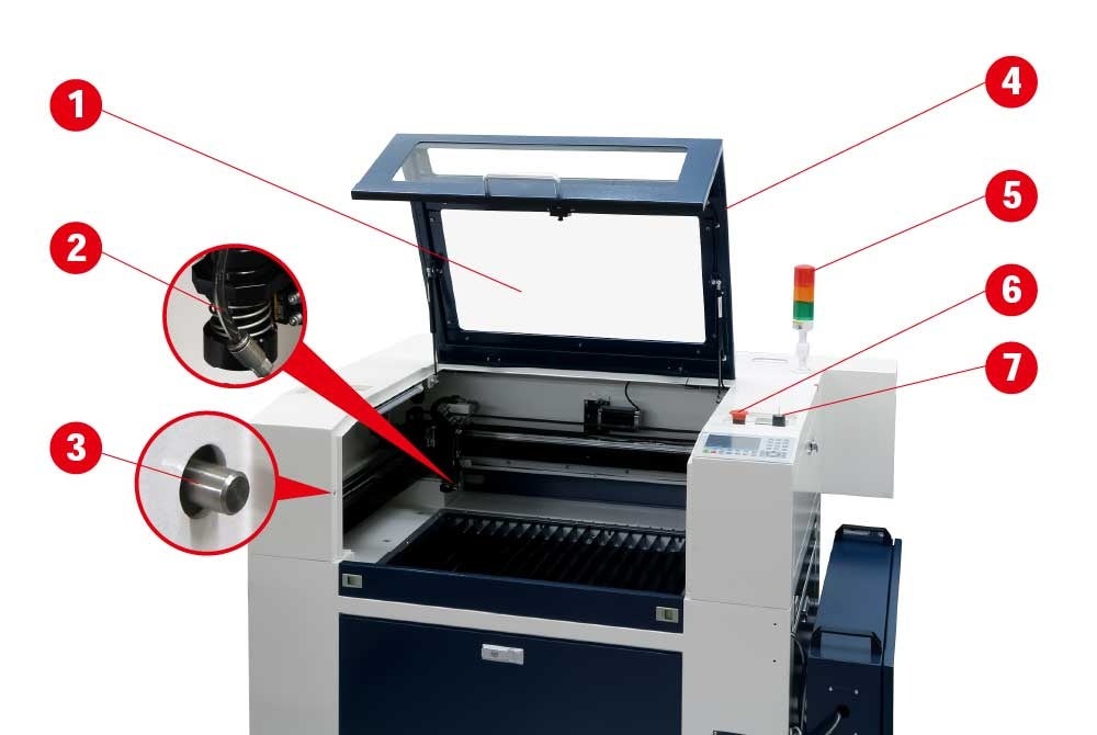 レーザー加工機は使用方法を誤ると火災や事故につながる可能性がある機器です。火災や事故の発生を防ぐためにHL650R/HL650はいくつかの安全対策を講じています。