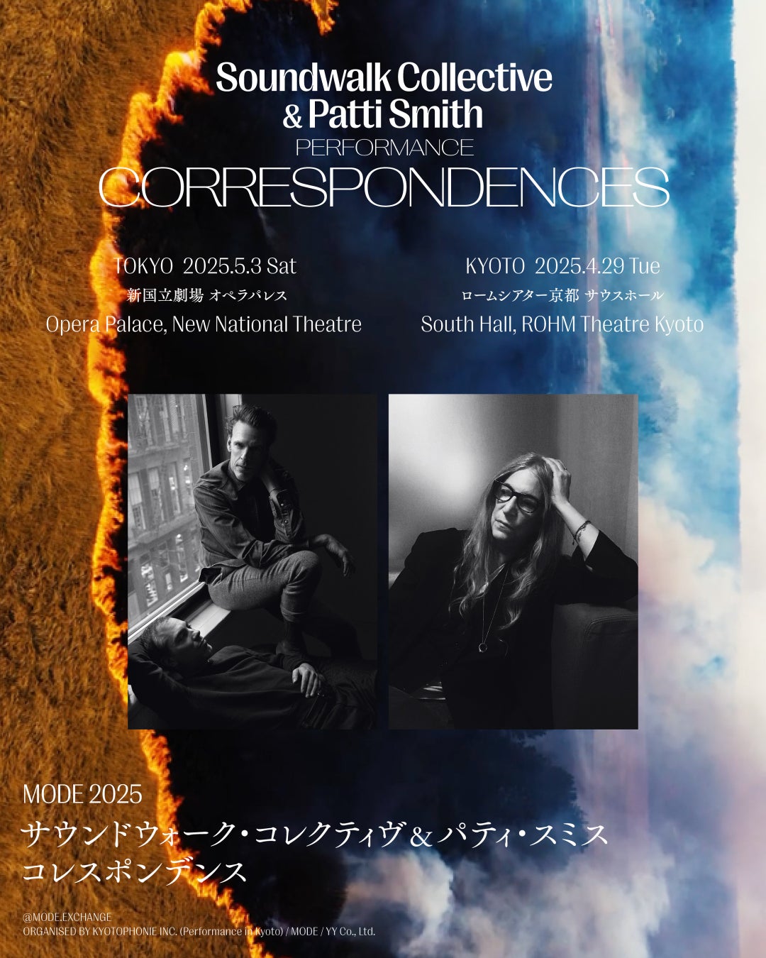 実験音楽、オーディオビジュアル、パフォーミングアーツを紹介するイベントシリーズ「MODE」は、世界的な文化アイコンであるパティ・スミス(Patti Smith)とNY/ベルリンを拠点に活動する現代音響芸術コレクティヴのサウンドウォーク・コレクティヴ(Soundwalk Collective)による最新プロジェクト「コレスポンデンス(CORRESPONDENCES)」を2025年4月から東京と京都で開催いたします。