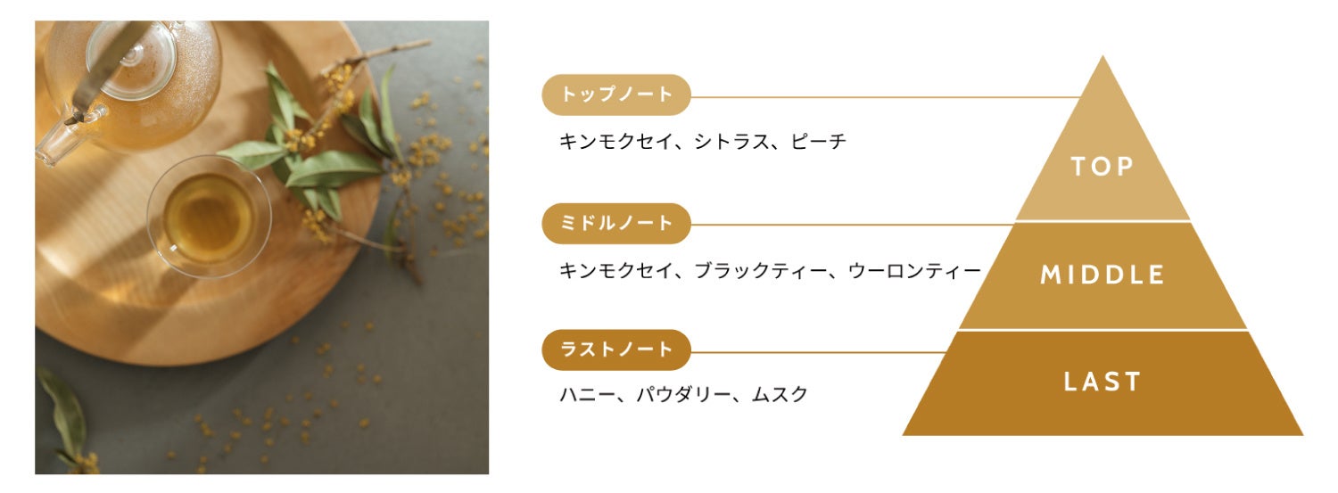 トップは華やかさとみずみずしさを感じるキンモクセイとピーチに、爽やかなシトラス。ミドルは紅茶や烏龍茶にキンモクセイが柔らかに香ります。ラストはパウダリーな甘さの中にムスクを感じさせる大人の香り。