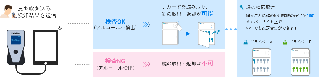 アルコール検知器と鍵管理システムの連携で車両鍵の運用を厳正化