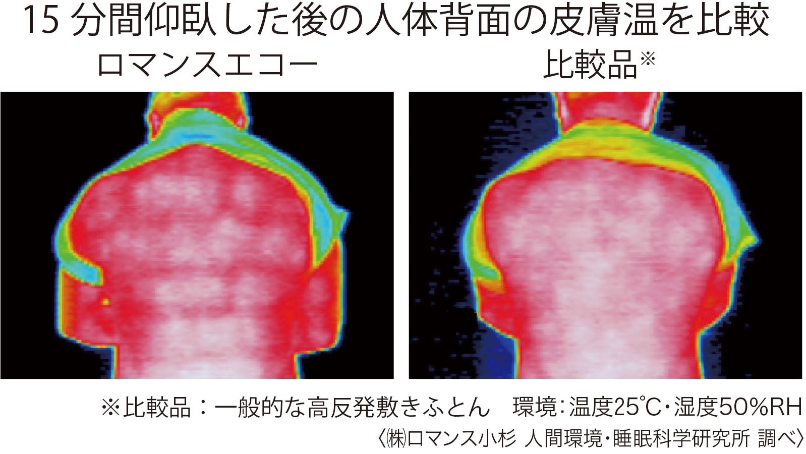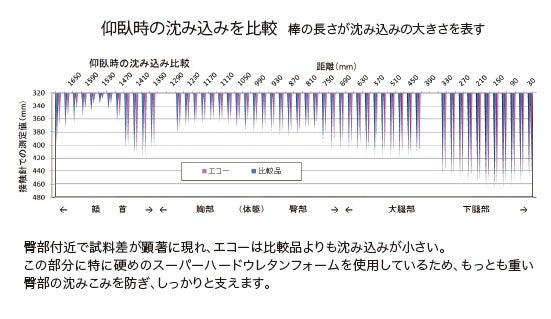 臀部付近で試料差が顕著に現れ、エコーは比較品よりも沈み込みが小さい。この部分に特に硬めのスーパーハードウレタンフォームを使用しているため、もっとも重いやわらかすぎるふとんの場合エコーの上層に用いられているポリエチレンフォームはウレタンフォームに比べて、圧縮強さをはじめ、緩衝性に関する数値が非常に高いです。反発弾性が高く硬さが硬いものが寝返り性が良いとされています。臀部の沈みこみを防ぎ、しっかりと支えます。