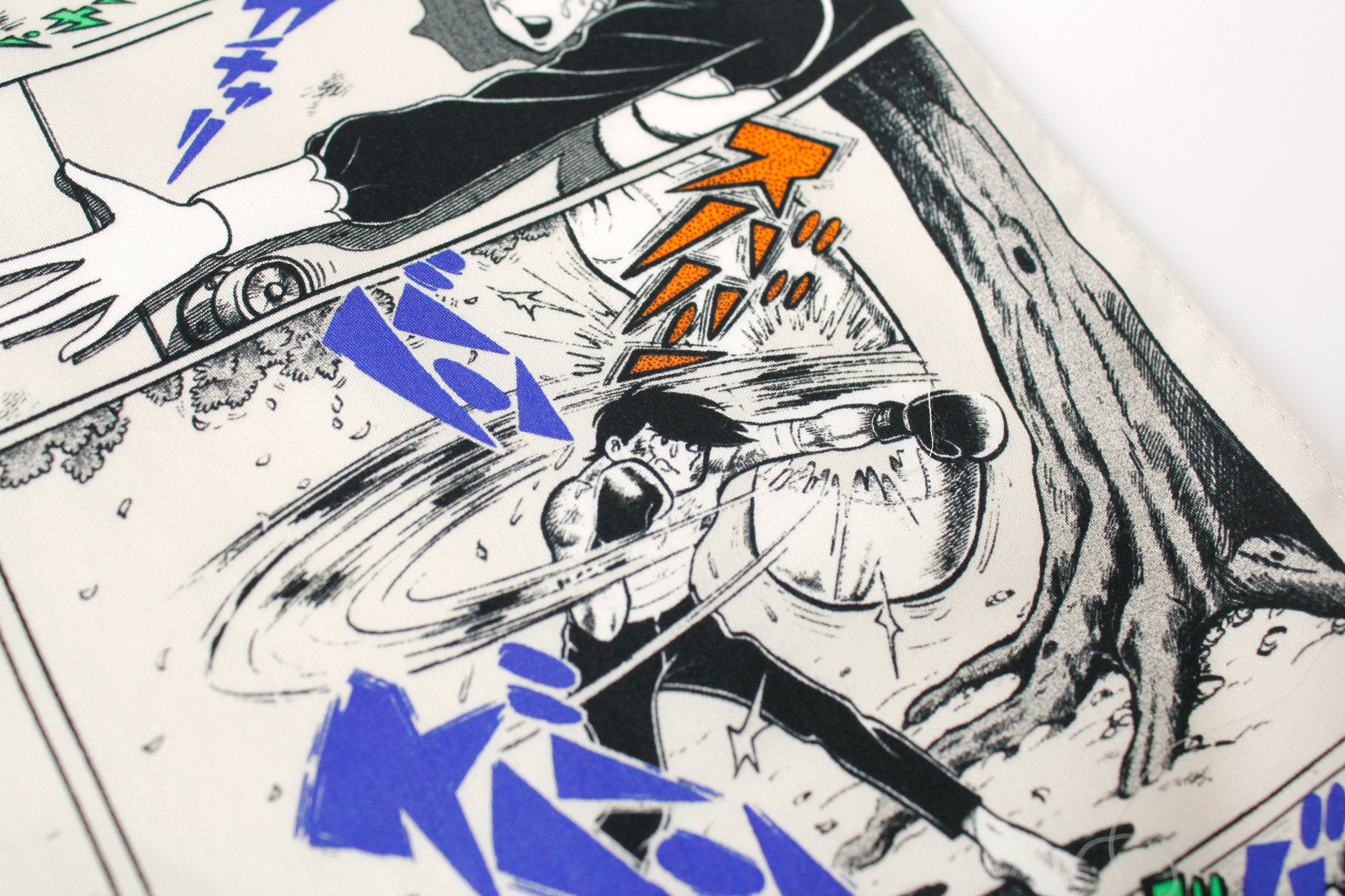 せりふの代わりに放たれるような擬音語に着目し、印象的なコマを集めた。コミカルでレトロな雰囲気が漂うハンカチ。