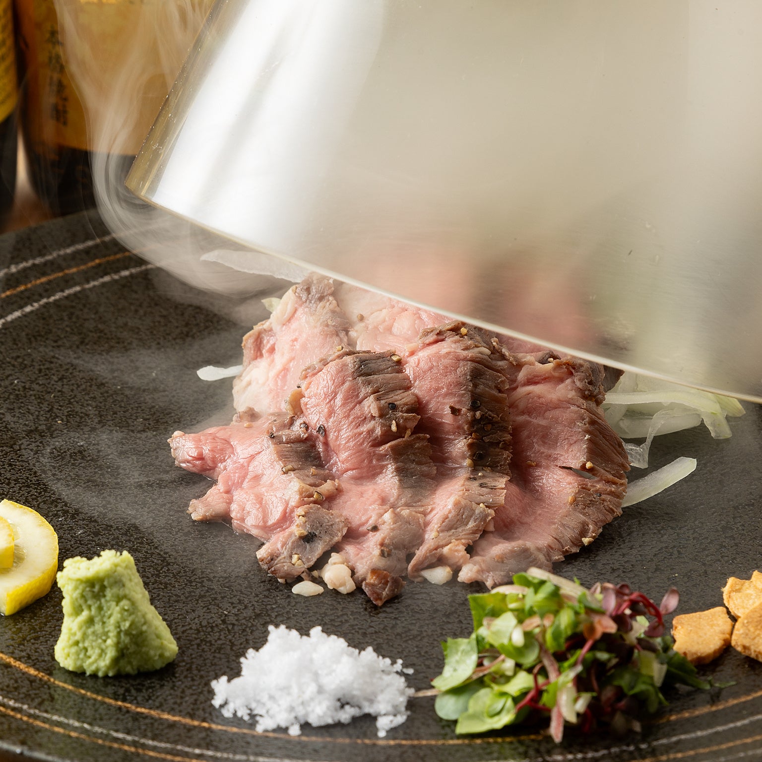 黒毛和牛を炙る事により脂が香ばしく香る。