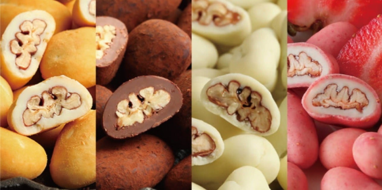 今回は、キャンディーコートピーカンナッツ/ココアがけピーカンナッツ/塩ピーカンナッツ/ストロベリーピーカンナッツの4種類の味をご用意しました。