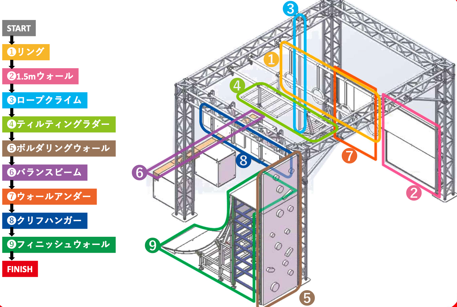 種目:リング→1.5mウォール→ロープクライム→ティルティングラダー→ボルダリングウォール→バランスビーム→ウォールアンダー→クリフハンガー→フィニッシュウォール