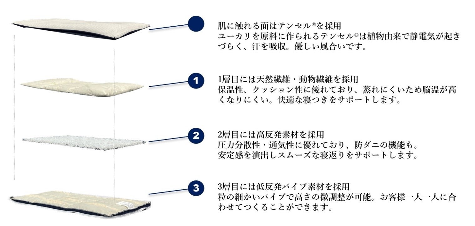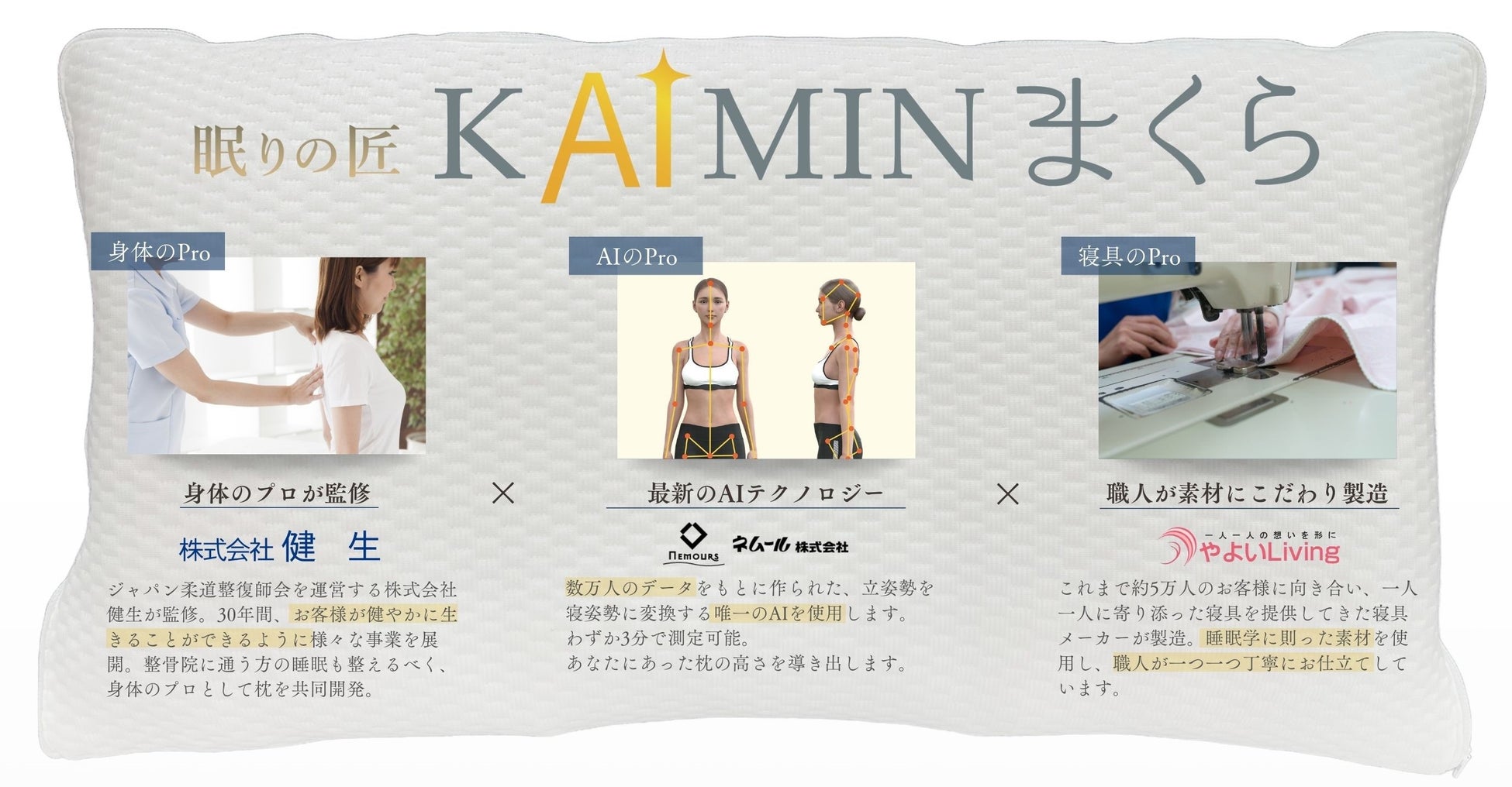 この知見を基に、株式会社やよいディライトは天然素材と人工素材を掛け合わせた寝具の開発に力を入れており、今回のオーダーメイド枕「眠りの匠 KAIMINまくら」もその一環です。