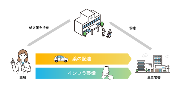 このサービスにより、薬局は患者に対して訪問の必要がなく、医薬品の適切な服薬指導が可能になります。また自社配送だけでは難しい、しっかりと教育された質の高いお届けスタッフを通した患者との関係性の構築や、ITによる配送の効率化、受付から配送依頼までのデジタル化を一括で請け負います。