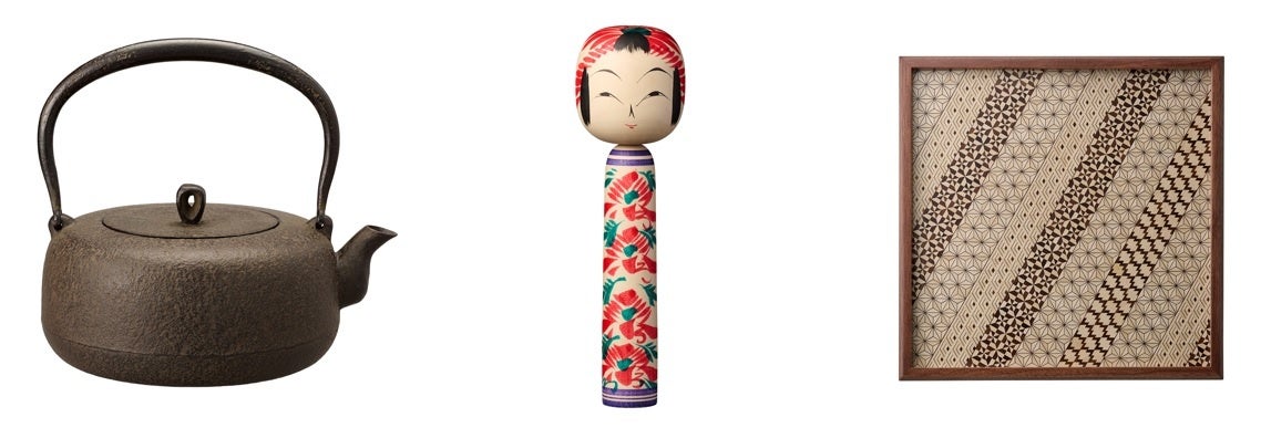 (左から)南部鉄器(岩手県)「平丸小肌」 / 宮城伝統こけし(宮城県)「遠刈田系伝統こけし 1尺」 / 箱根寄木細工(神奈川県)「角盆」