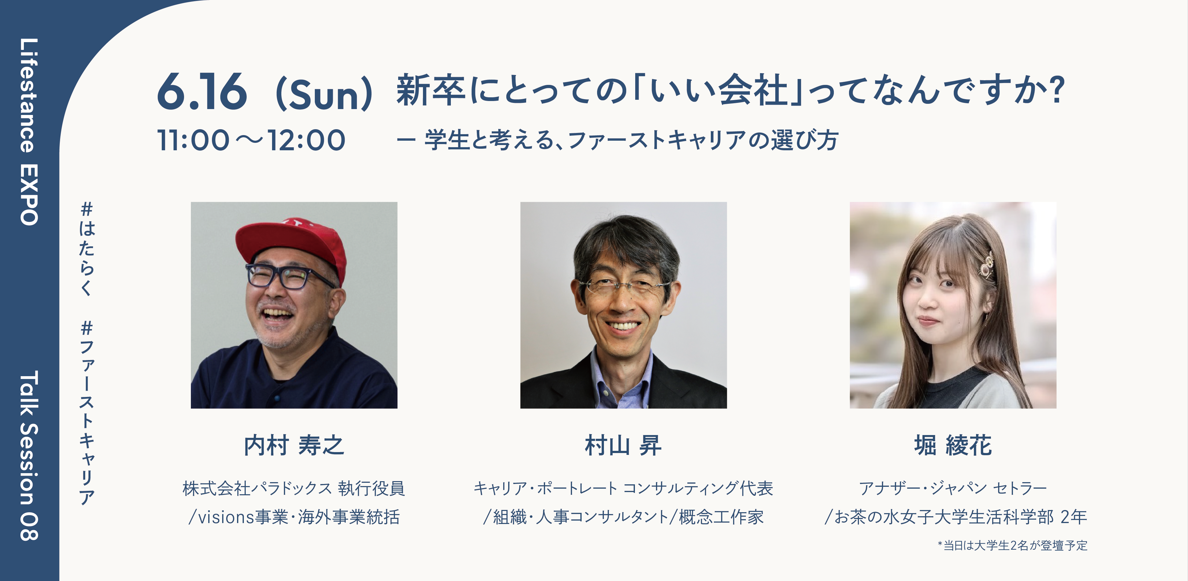 登壇者:内村 寿之(株式会社パラドックス 執行役員/visions事業・海外事業統括 )、村山 昇(キャリア・ポートレート コンサルティング代表 / 組織・人事コンサルタント / 概念工作家)、堀 綾花(アナザー・ジャパン セトラー / お茶の水女子大学生活科学部 2年)