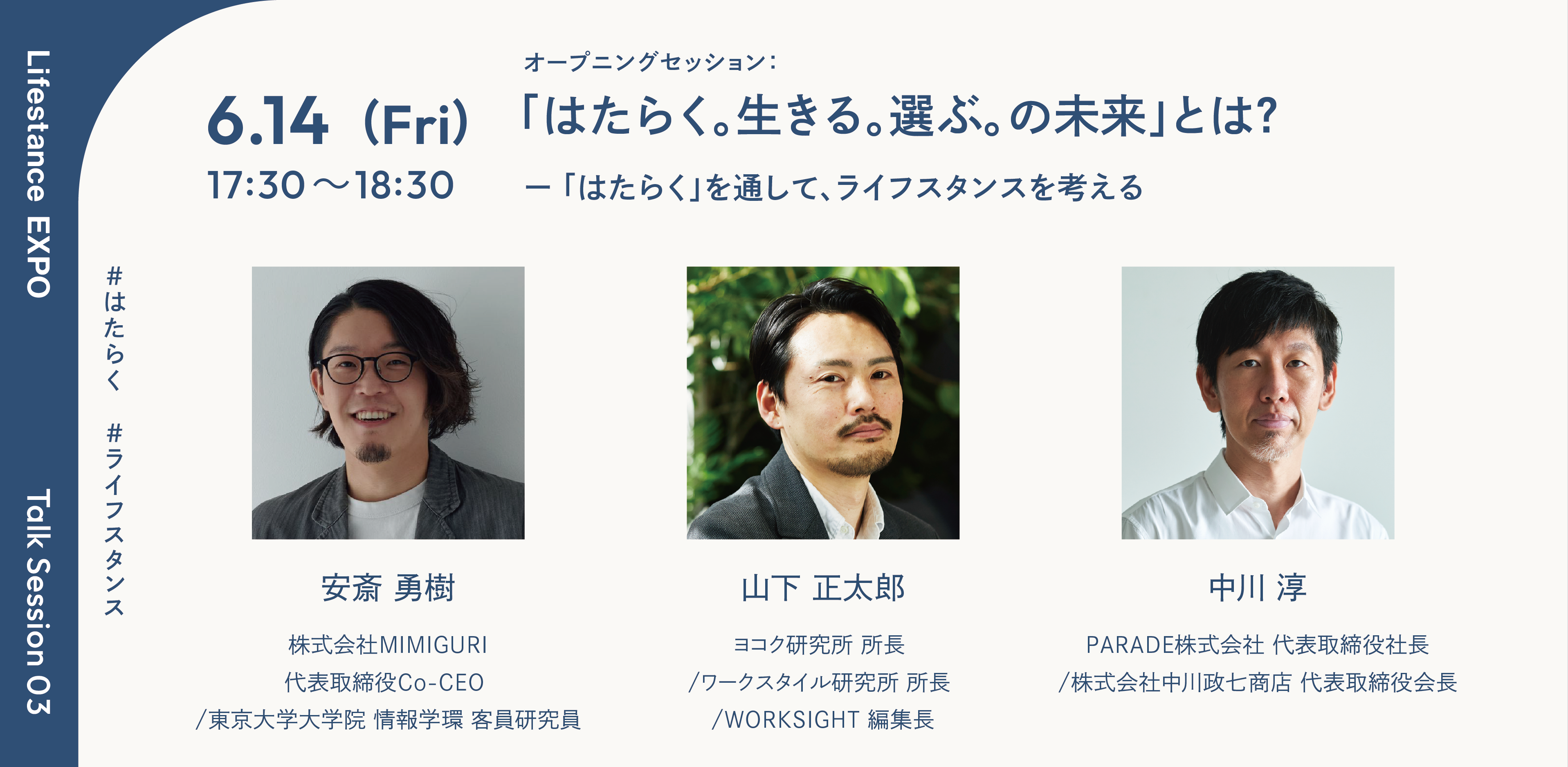 オープニングセッション(6月14日(金)17:30〜、参加無料)では、「はたらく。生きる。選ぶの未来」とは?と題して安齋勇樹氏(株式会社MIMIGURI 代表取締役Co-CEO / 東京大学大学院 情報学環 客員研究員)、山下正太郎氏(ヨコク研究所 所長 / ワークスタイル研究所 所長 / WORKSIGHT 編集長)をゲストスピーカーに迎え、これからの時代における「個人のはたらき方/はたらきがい」や「はたらく人と職場の関係性」、「企業文化」などを切り口にトークセッションを行います。