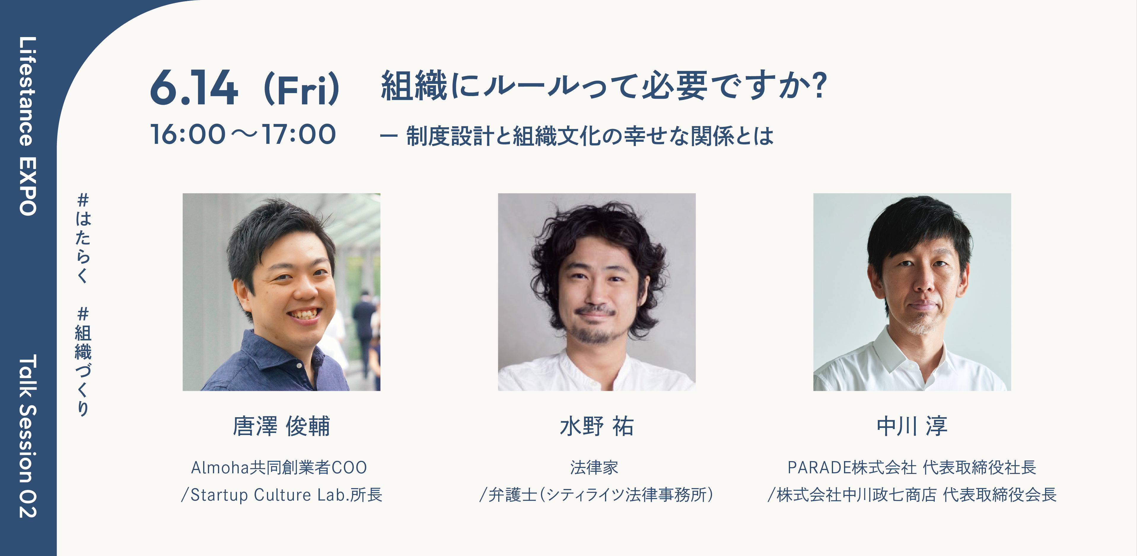 登壇者:唐澤 俊輔(Almoha共同創業者COO / Startup Culture Lab.所長)、水野 祐(法律家 / 弁護士 シティライツ法律事務所)、中川 淳(PARADE株式会社 代表取締役社長 / 株式会社中川政七商店 代表取締役会長)