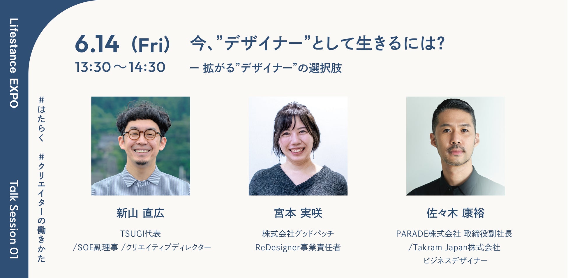 登壇者:新山 直広(TSUGI代表 / SOE副理事 / クリエイティブディレクター)、宮本 実咲(株式会社グッドパッチ/ReDesigner事業責任者)、佐々木 康裕(PARADE株式会社 取締役副社長 / Takram Japan株式会社 ビジネスデザイナー)