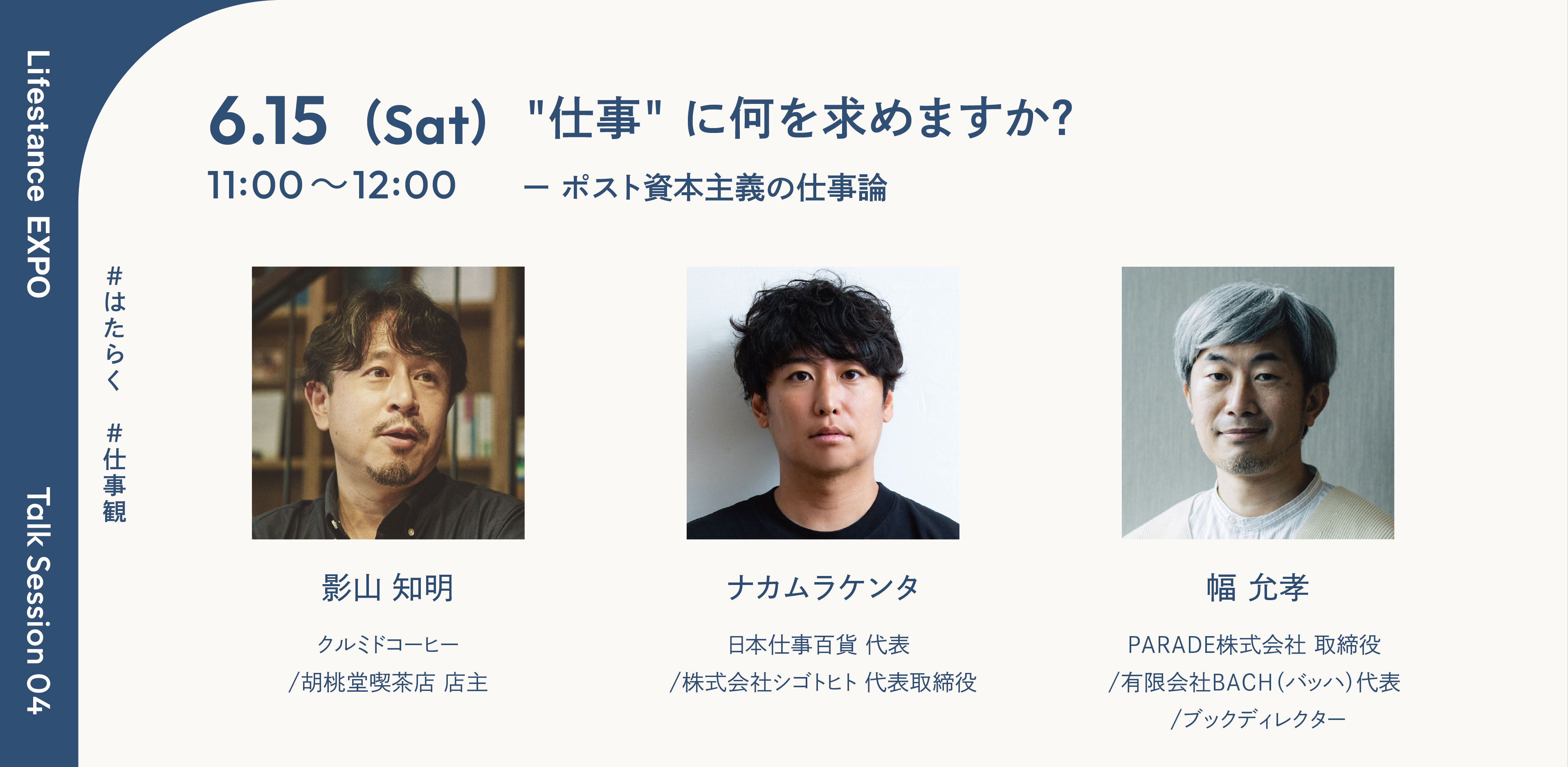 登壇者:影山 知明(クルミドコーヒー/胡桃堂喫茶店 店主)ナカムラケンタ(日本仕事百貨 代表 / 株式会社シゴトヒト 代表取締役)幅 允孝(PARADE株式会社 取締役 / 有限会社BACH 代表・ブックディレクター)
