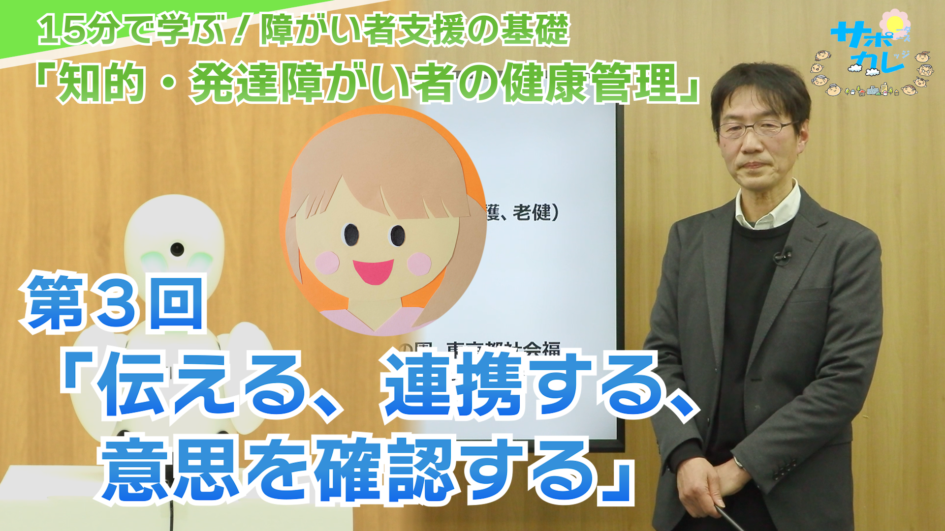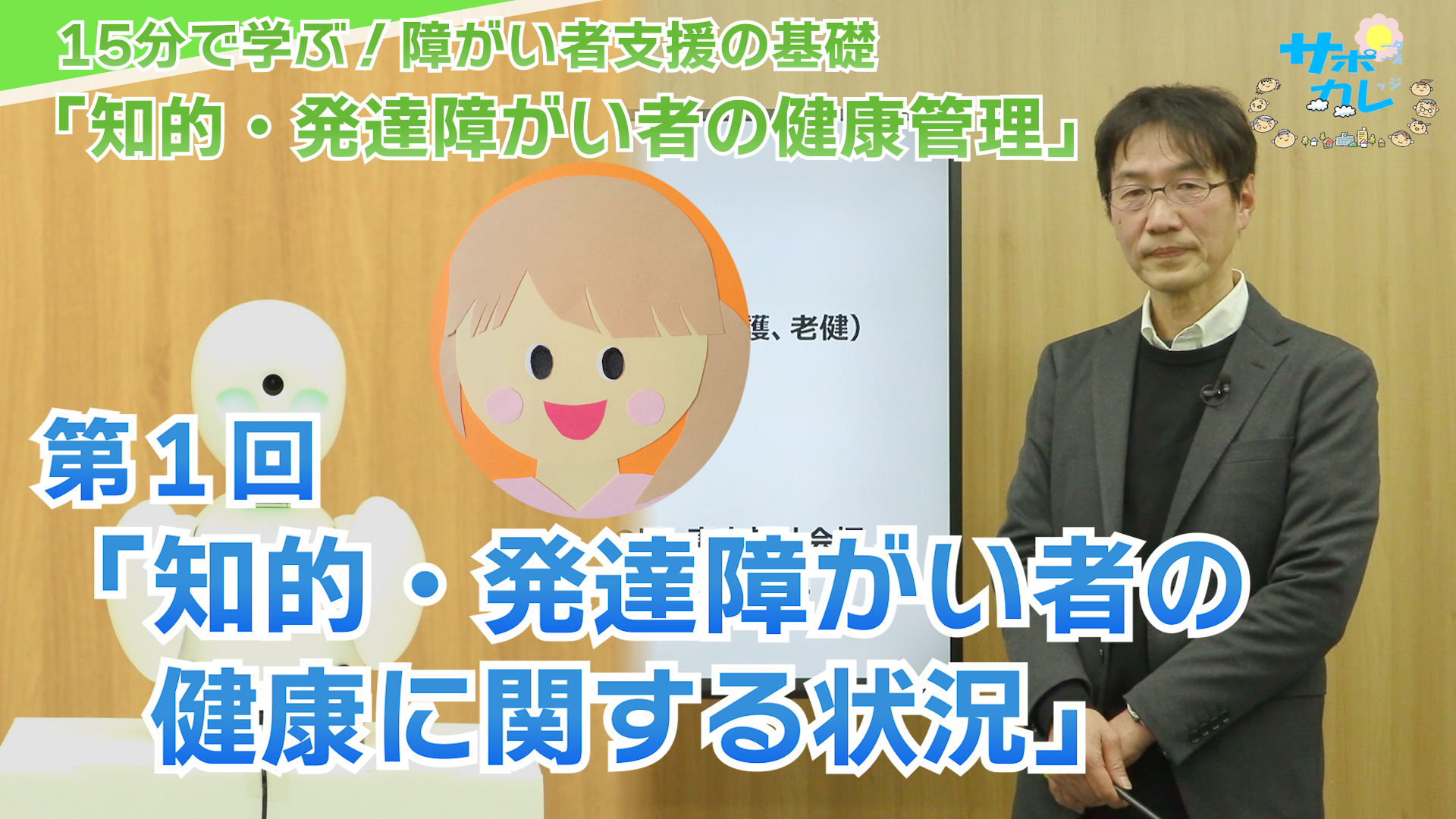 本講義では、知的・発達障がい者の健康に関する状況をデータに基づき解説し、利用者の健康に関する課題について取り上げています。また、健康維持や増進、早期発見・早期対応に向けた具体的なチェックポイントを挙げ、医師や看護師との連携についても講義しています。日常的に関わる利用者のみなさんの健康管理に向けて是非、ご視聴ください。