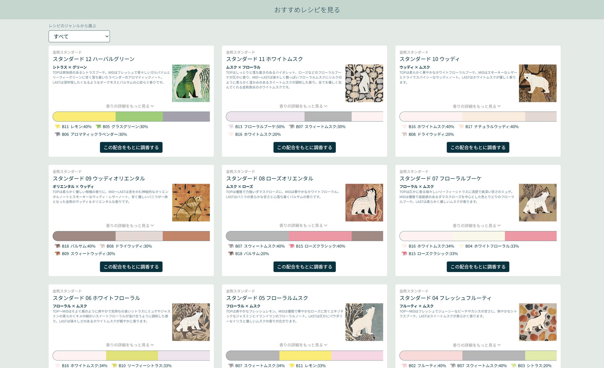 「おすすめレシピ」には、金熊香水のスタンダードレシピや、調香師、スタッフが考えたオリジナルレシピ、外部のクリエイター、香りの専門家、香水愛好家が考えたレシピ等が掲載されており、調香が初めての方でも、おすすめレシピの中から自分に合いそうな香りを選んで、それを基に調香を始めることができるので安心です。