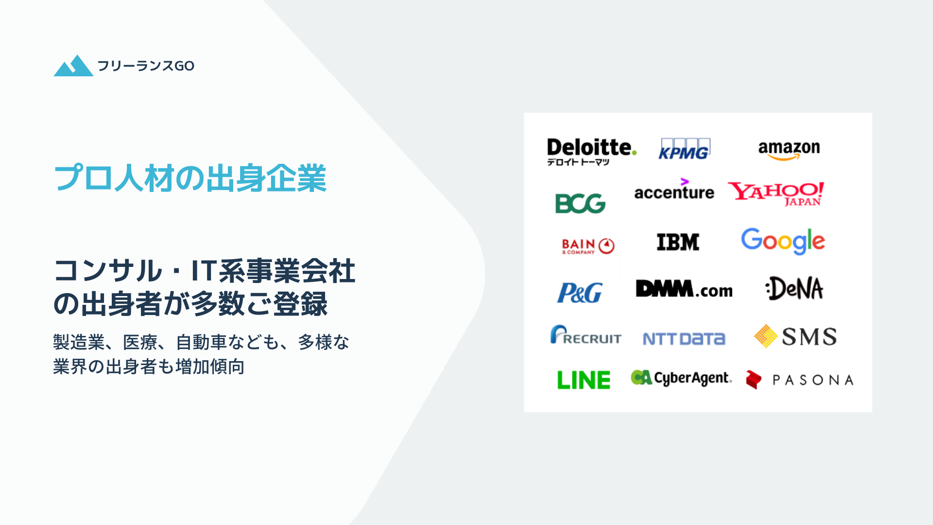 - フリーランスGOで、コンサル/IT系事業会社出身のプロ人材をアサイン