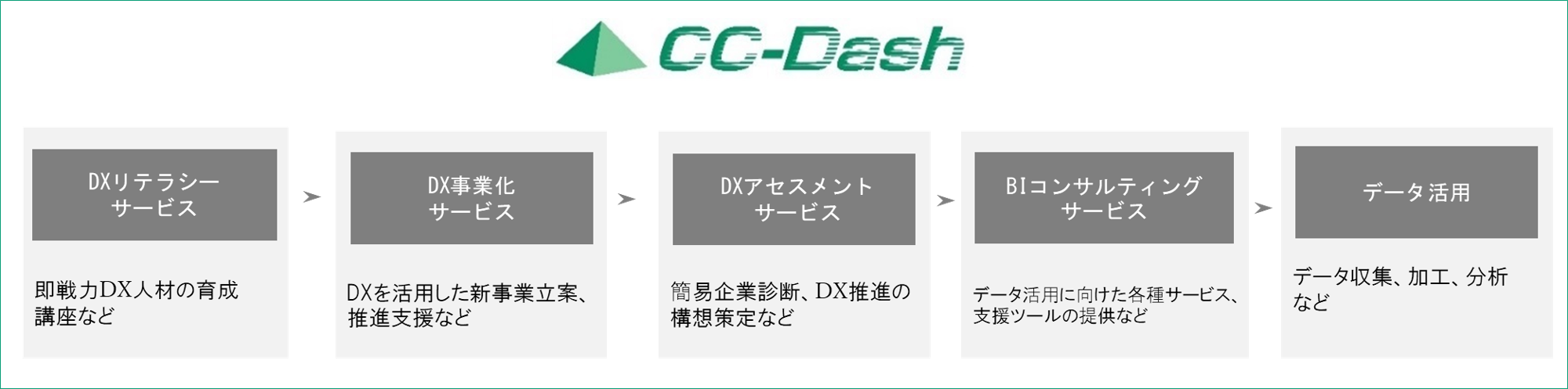 「CC-Dash」は、データ活用によってお客様のDX推進を支援する独自のフレームワークです。DXを推進する際の各フェーズ(①知る②つくる③集める④整える⑤分析する⑥活かす)における様々な課題に対し、テンプレート化と各種コンサルティングサービスをお客様に提供しています。加えてアライアンス等によってソリューションサービスのラインナップを随時追加・拡充していくことで、お客様のDX推進状況に合わせた支援策をワンストップで提供していきます。