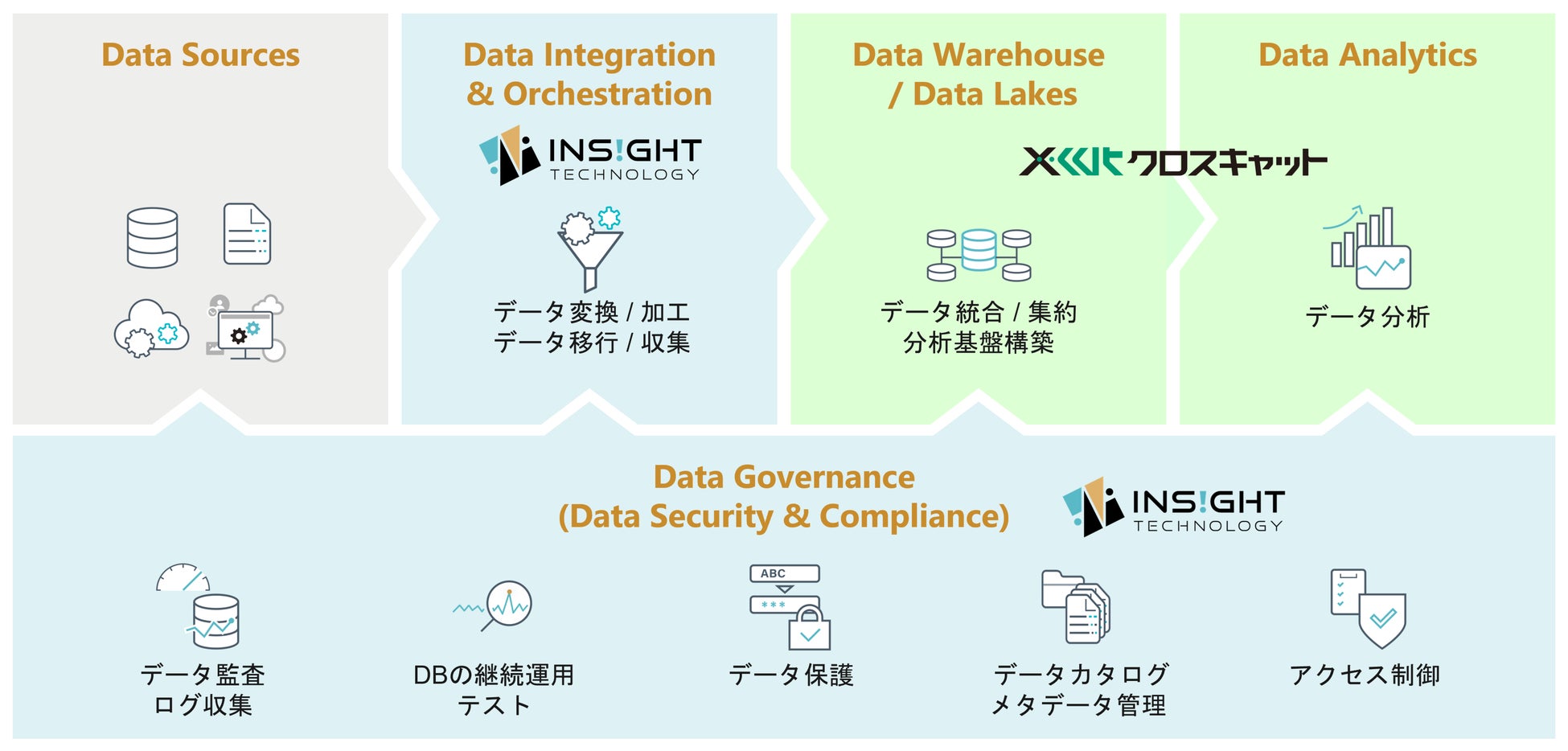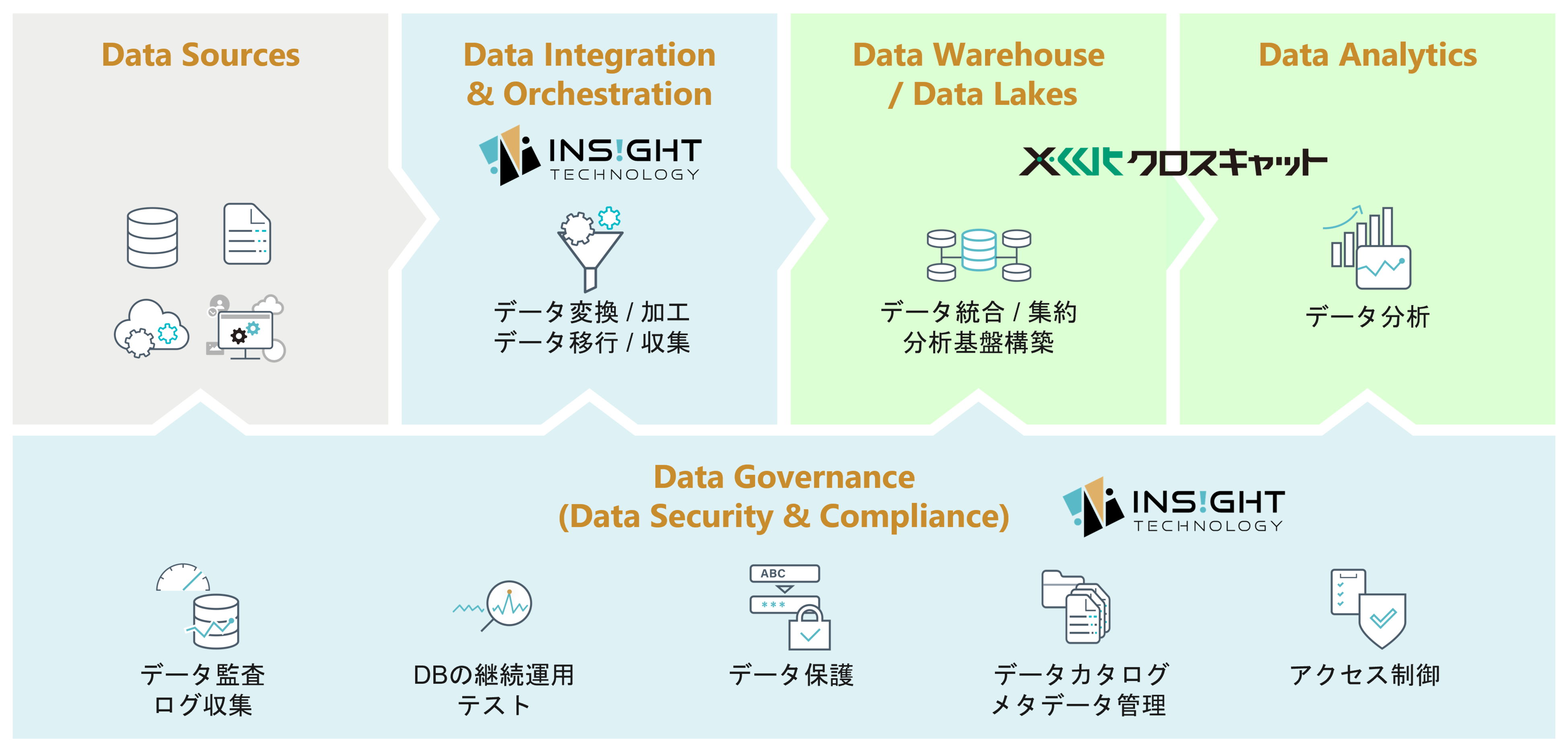 インサイトテクノロジーは、これまでのデータベースに特化した経験と実績を生かし、企業のデータの価値を高めていく上で重要なポイントである「データインテグレーション」と「データガバナンス」の2つの領域のソリューションを提供することで、データの民主化(誰もが、いつでも、どこでも、新鮮なデータを迅速に活用)を強力に推進します。