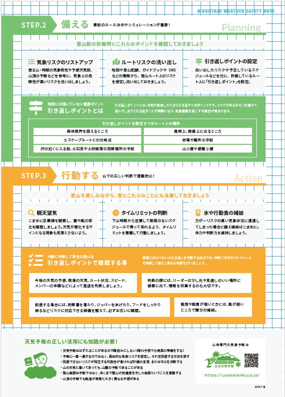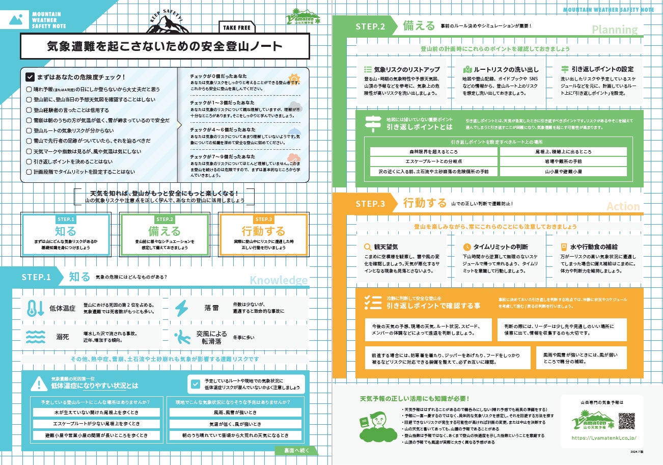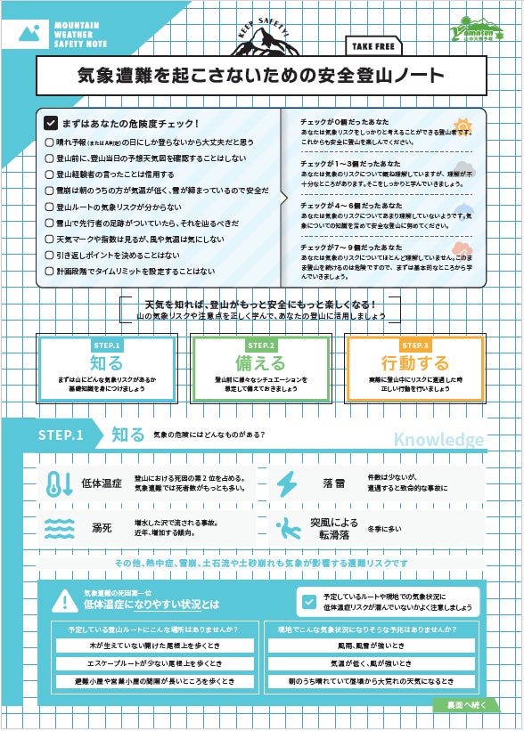 この安全登山ノートは幅広い登山者に気象情報の正しい使い方などを広く知ってもらい、気象遭難を防ぐために作成したものです。今の自分の登山時の危険度をチェックできるうえ、より安全に登山を楽しむための3つのSTEP「知る」「備える」「行動する」について、まとめてあります。