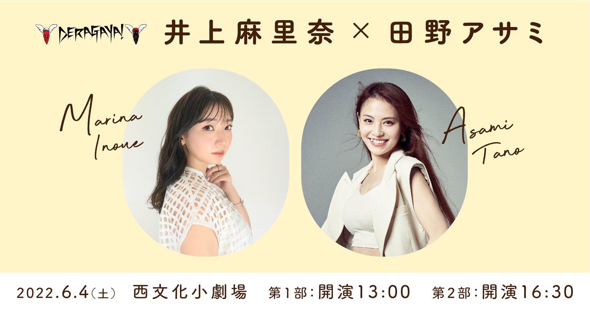 今回のDERAGAYA!では、『進撃の巨人』アルミン・アルレルト役や『境界のRINNE』真宮桜役を務める井上麻里奈と、『ゾンビランドサガ』二階堂サキ役や『ラブライブ!サンシャイン!!』鹿角聖良役を務める田野アサミという二人の声優によるトークイベントを開催します。『スマイルプリキュア!』でも共演し、プライベートでも仲の良い二人。今回のイベントでは、二人のエピソードを語るコーナー、クイズや質問形式で答えていくコーナーに加え、歌唱コーナーも実施。二人がセレクトした楽曲を歌唱予定です。また、二人が考案したオリジナルグッズの販売も予定しております。今回は2部公演となりますが、第1部と第2部は異なる内容を予定しており、詳細は当日のお楽しみとなります。ぜひご参加ください。