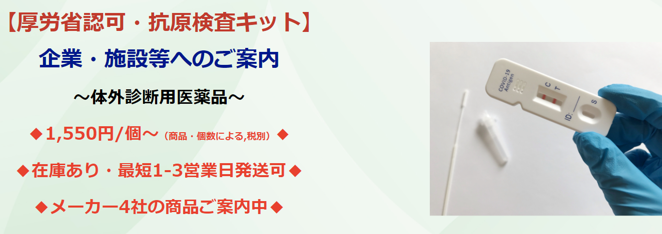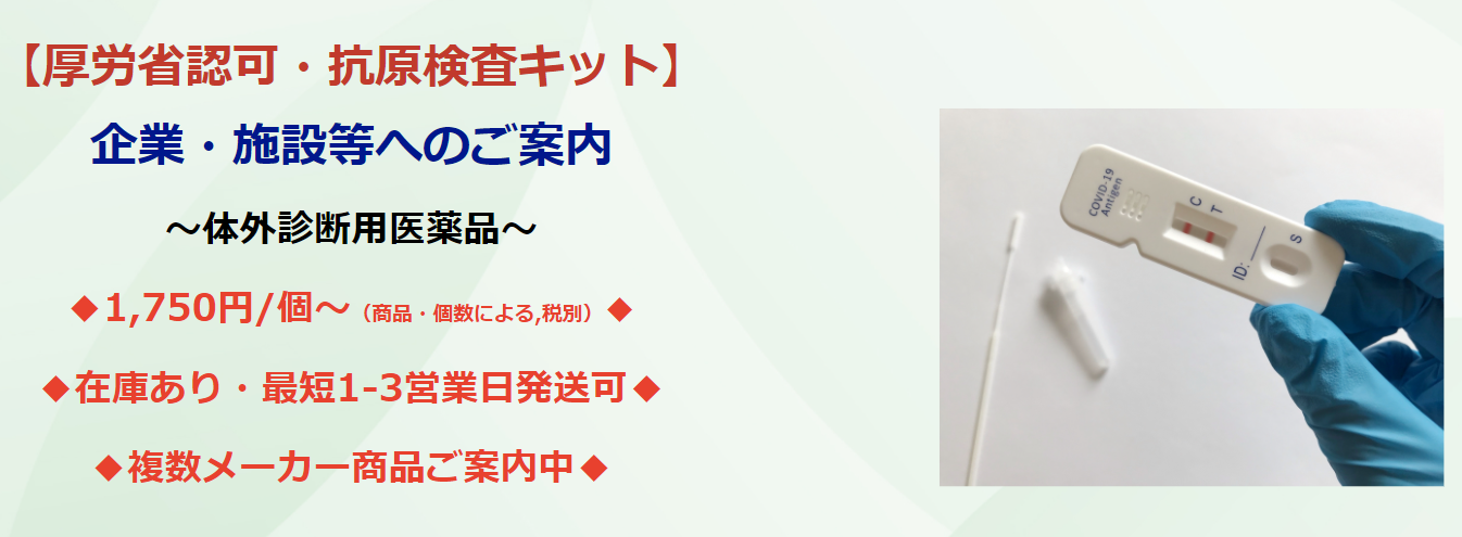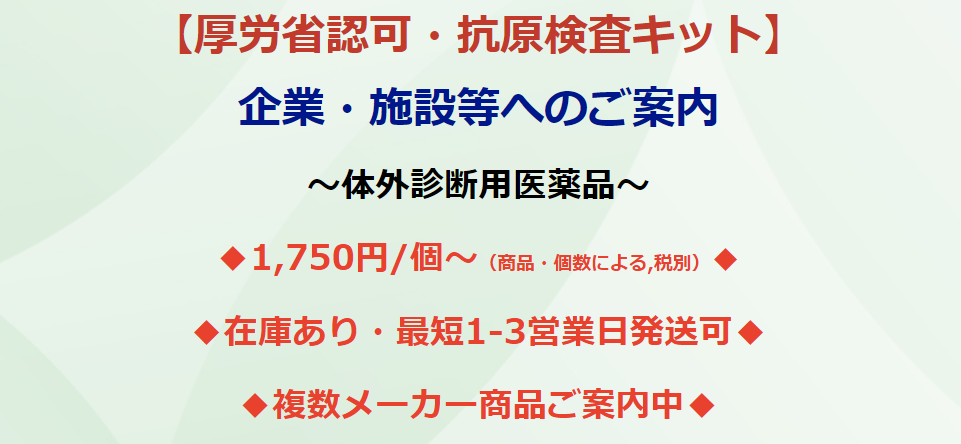 「研究用」ではなく、厚労省認可の「体外診断用医薬品」キットを扱いたい。厚労省認可の抗原検査キットを複数メーカー商品のご案内を開始しましたのでお知らせいたします。