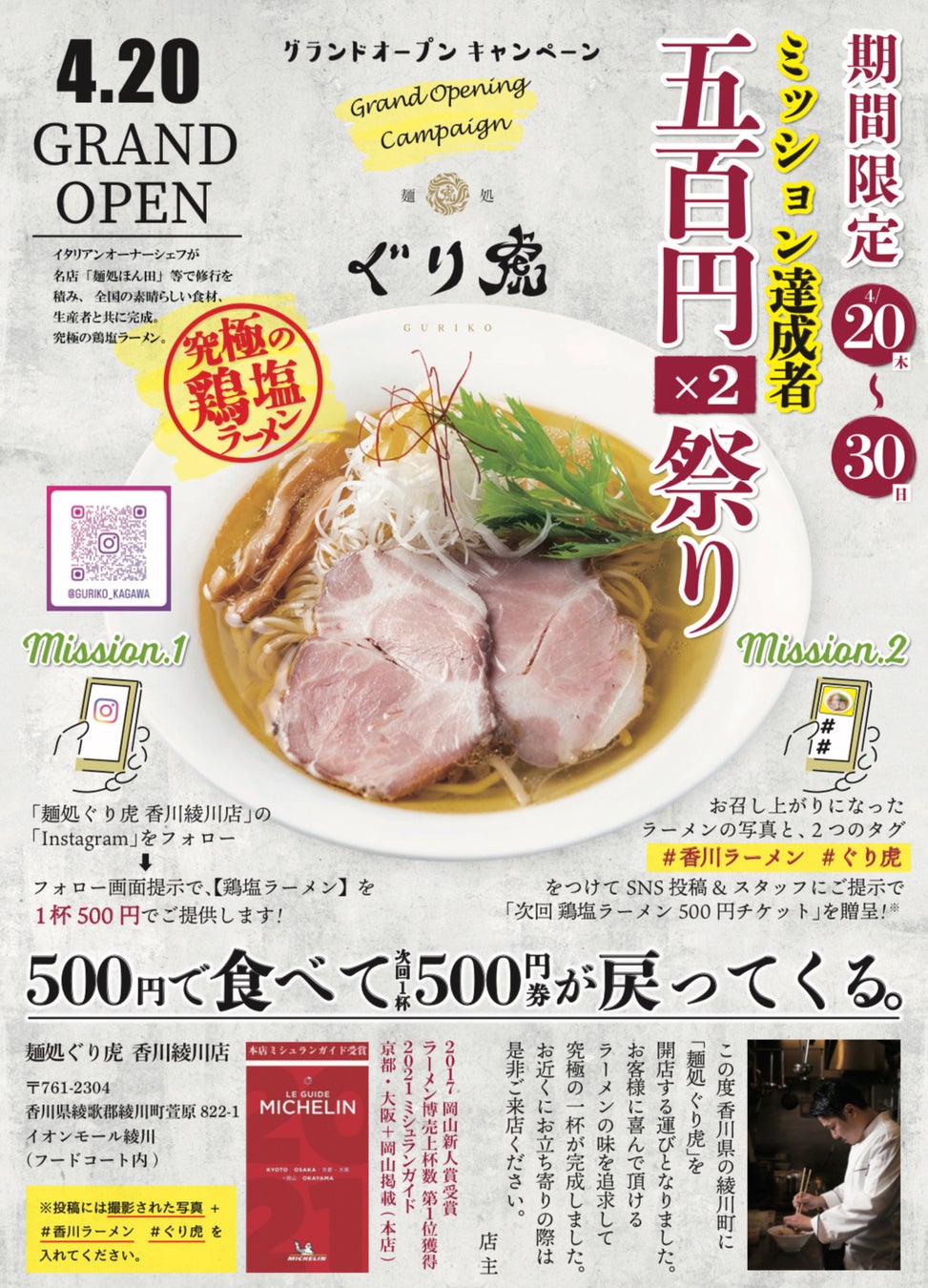 グランドオープン!感謝記念として4/20(木)~4/30(日)の間、ぐり虎の「鶏塩ラーメン」を【1杯500円】でご提供!さらに!!