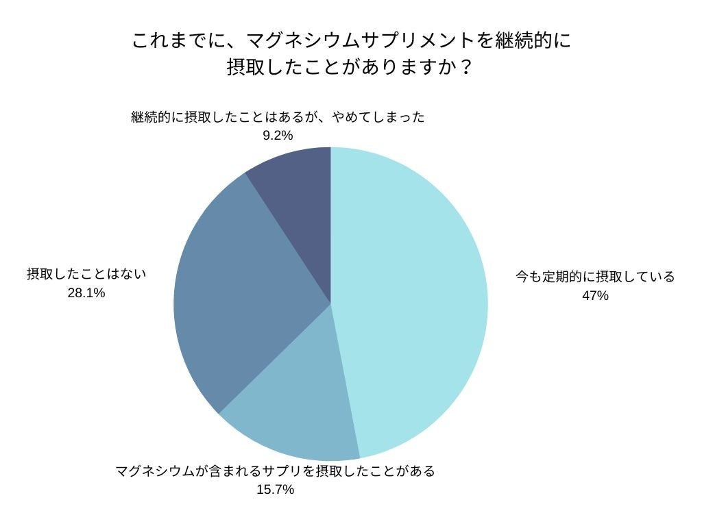 マグネシウムにサプリメントの摂取経験についての問いでは、47%が「今も定期的に摂取している」と回答したことから、マグネシウムを日常的にとっている人のあいだでも、具体的な「摂取量」についてはあまり関心が高くなく、あくまでマグネシウムの「身体に必要というイメージ」からの摂取しているのではないか、と予測できます。