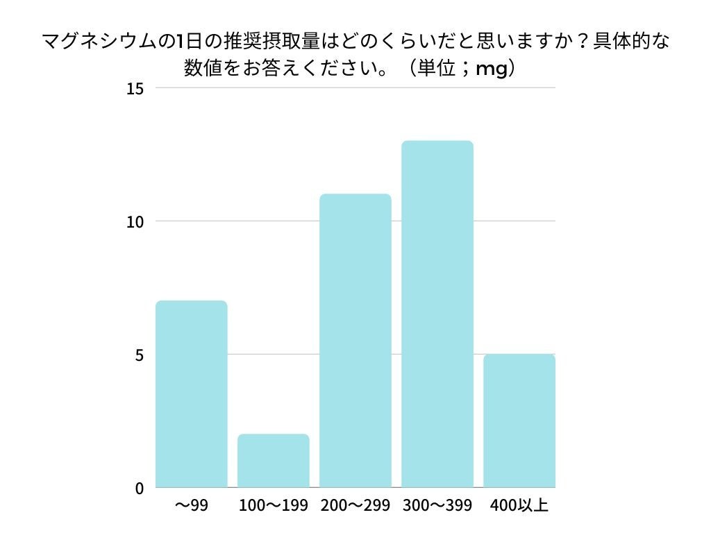 つまり、「マグネシウムの推奨摂取量を知っている」と回答した人の半数が、正確な数値を認識していない、という結果になりました。