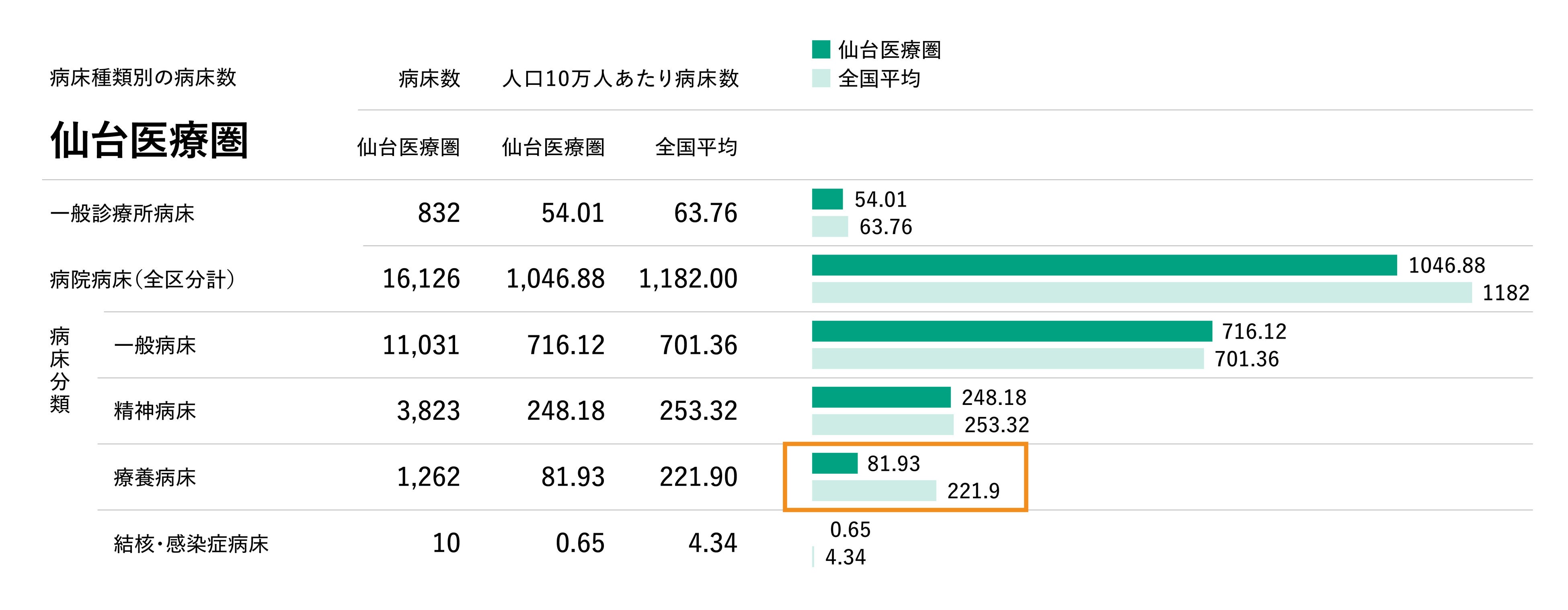 仙台医療圏は、長期にわたる療養を必要とする人が入院する療養病床の数も不足しています。人口10万人あたりの療養病床数は、全国平均が221.9であるのに対し、仙台医療圏は81.93と、全国平均の36%程度に留まっています。