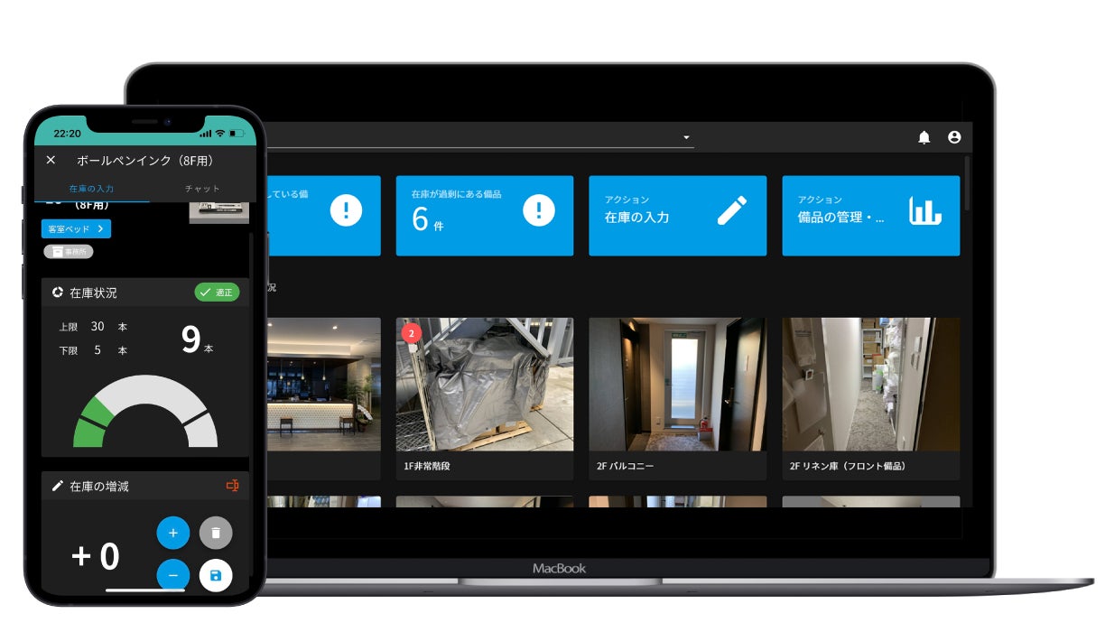 HoteKan備品では、清掃スタッフがアメニティや客室備品の在庫の出し入れをする際にスマホで数量を簡易に入力します。ホテルスタッフが毎月の棚卸をすることなく、在庫数の状況や変動がリモートで分かります。在庫の下限値を下回ると、自動で発注者にメールが飛び、発注忘れが防げます。