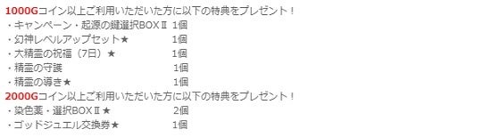 期間中、今までに一度も幻想神域のGコインをチャージされたことのない方が、ゲーム内のGモールにて一定額のGコインをご利用いただくと、任意の幻神を仲間にできる「キャンペーン・起源の鍵選択BOXⅡ」などの特典アイテムをプレゼントします。