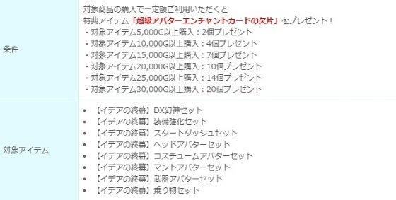 期間中に対象商品をご購入いただくと、一定額ごとに特典アイテム「超級アバターエンチャントカードの欠片」をプレゼントします。