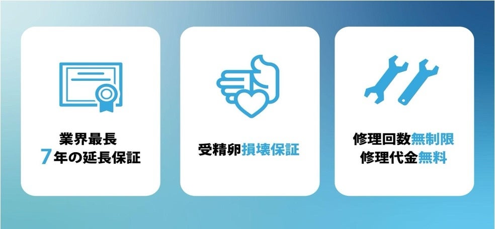 しかし、卵子凍結保管には多額の費用がかかり、凍結卵子が偶発的に損傷した際の補償はほとんど提供されていないのが現状です。 今回のサービス提供には、顧客の不安を軽減し、未来への備えを安心して進められる環境を整え たいという思いが背景にございます。多くの女性に新たな選択肢と可能性を提供し、安心してご利用いただけるように、業界初の最⻑7年にわたるインキュベーター機器の延⻑保証と「受精卵 損壊保証」を開発いたしました。