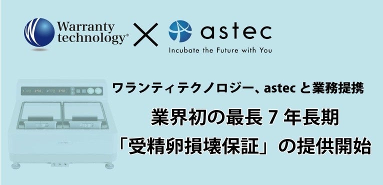 株式会社アステック(本社:福岡県糟屋郡志免町、代表取締役:園田勝裕)は、延⻑保証サービスの構築・運営を行う株式会社Warranty technology(本社:東京都千代田区、代表取締役CEO:宮原年明、以下「ワランティテクノロジー」) と業務締結し、業界初の最⻑7年インキュベーター機器の保証サービスを開始しました。 さらに、同機器の保証サービスにご加入いただくと、受精卵損壊保証も付随させていただきます。