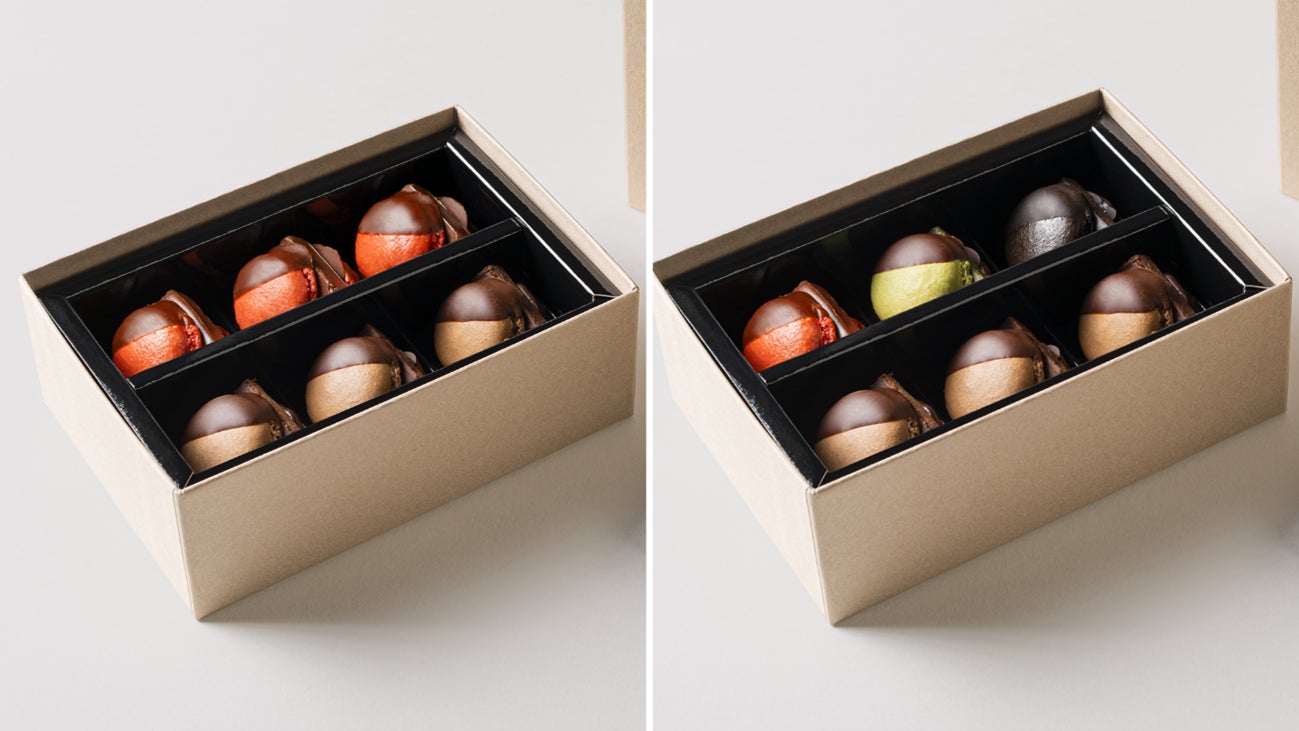 マカロンとチョコレートが織りなす複雑で深みのある味わいや香りを楽しんでいただくため、一粒の大きさを小ぶりにし、さらにカカオの香りがストレートに伝わる80%のチョコレートを上掛けしております。