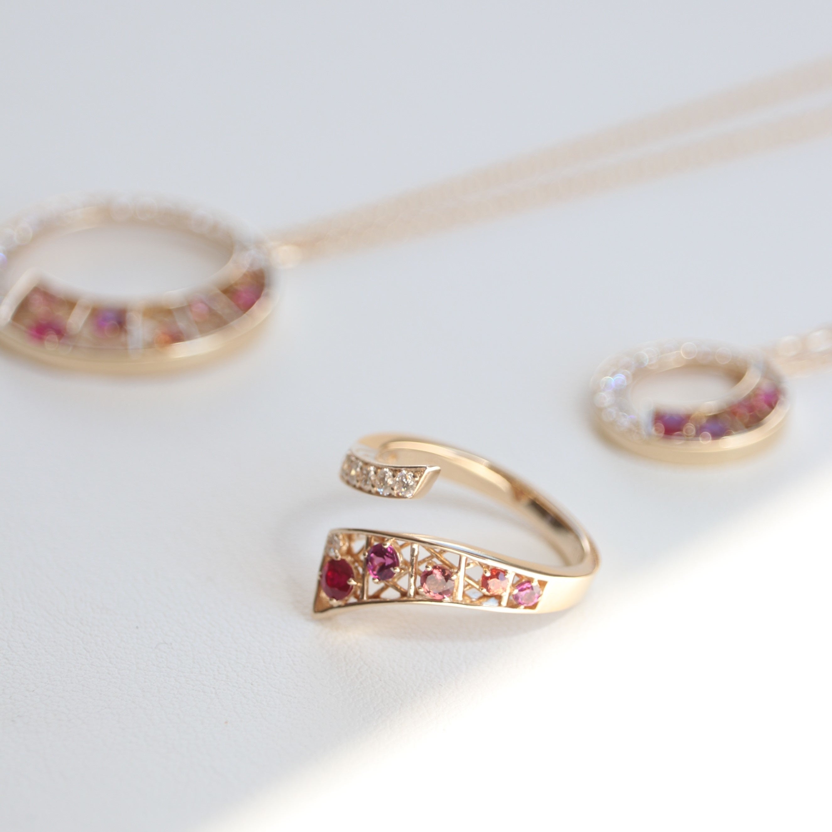香りをまとうように着けられるジュエリーをテーマに、源氏物語とそれにまつわる香道具から着想を得てデザインしました。 香が着物に焚き染められる情景を、地金と様々な色石で表現しています。