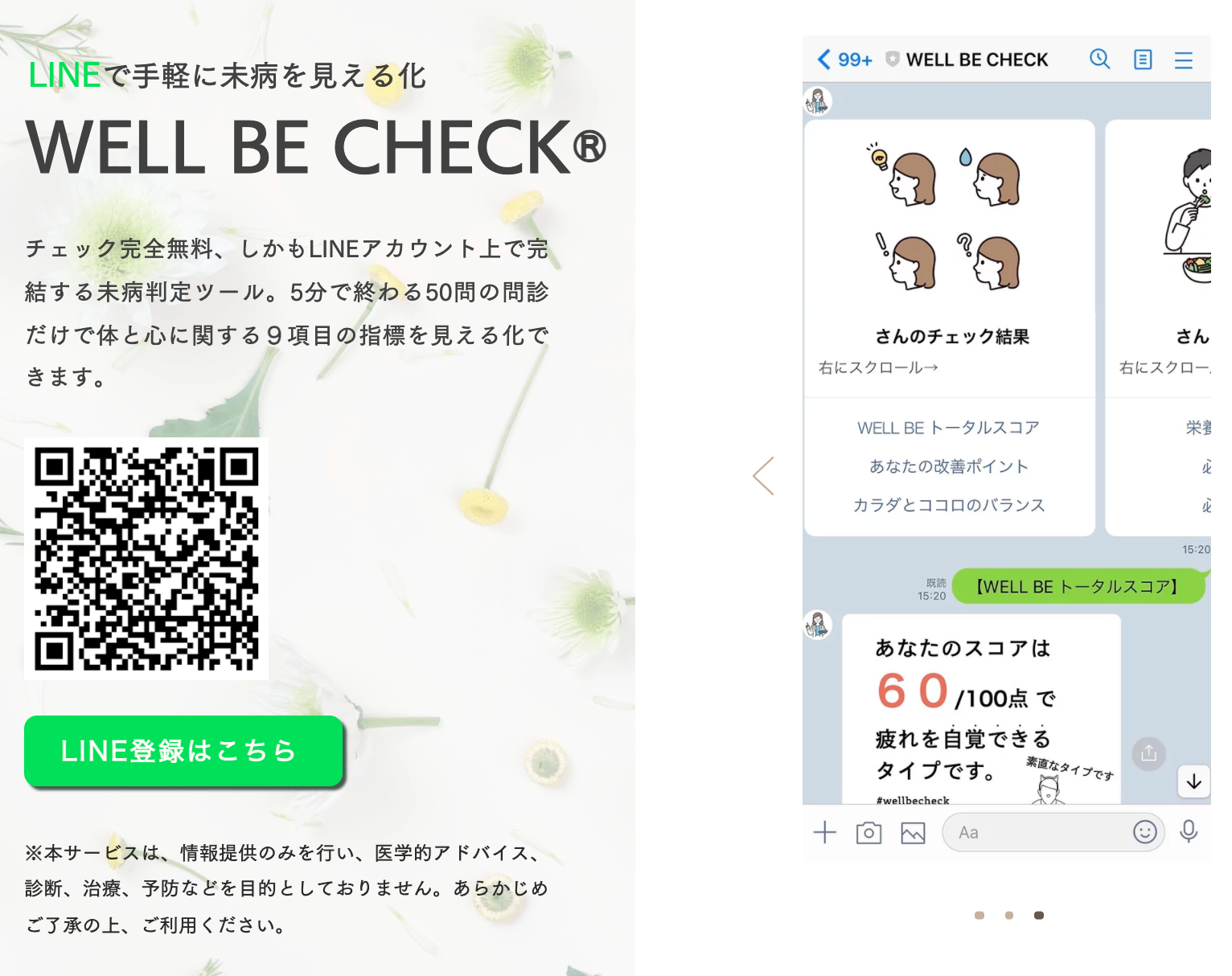 ※WELL BE CHECKの判定結果は臨床結果に基づくものではありません。あくまで目安とお考えください。WELL BE CHECKの目的は診断ではなく、気づきを与えその後の行動変容へ誘導することです。