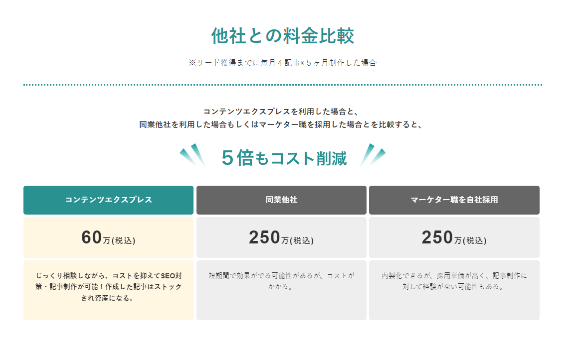 その解決のため、弊社では記事作成・コンテンツマーケティングの運用代行について抑えた価格で20社以上の検証運用を1年実施。従来の記事作成・コンテンツマーケティングの運用代行サービスよりも価格もコストダウン、お試し可能な運用代行サービス『コンテンツエクスプレス』の提供に至りました。