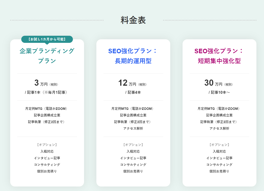 BtoB/BtoC/ITなど全ジャンル対応可能で、1か月からのトライアルも可能。月額3万円からの記事制作・コンテンツマーケティング運用代行を実現!