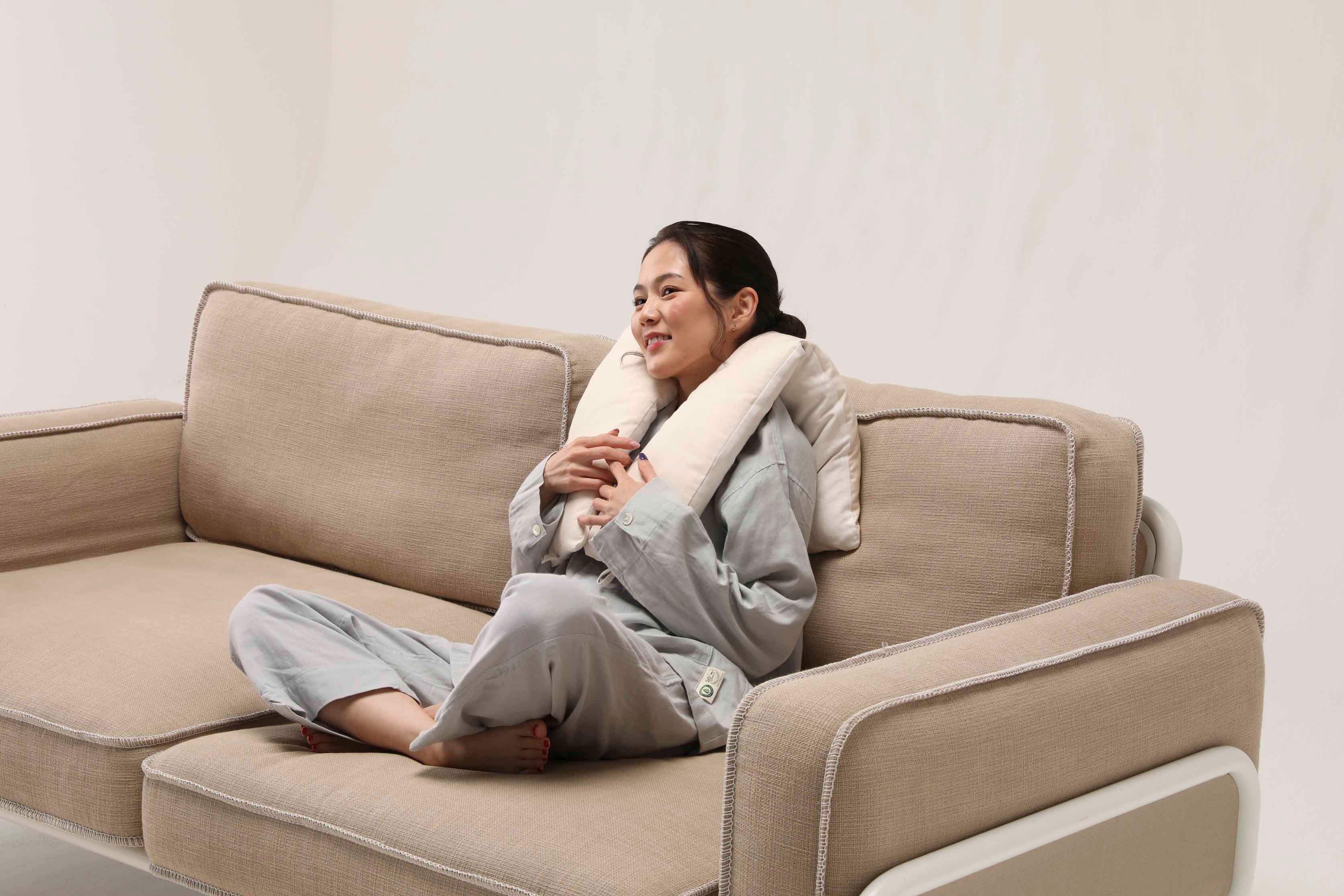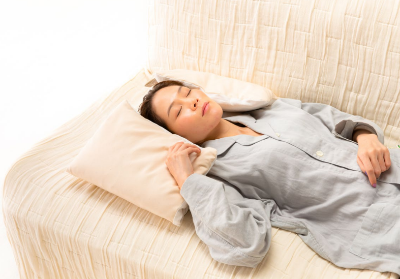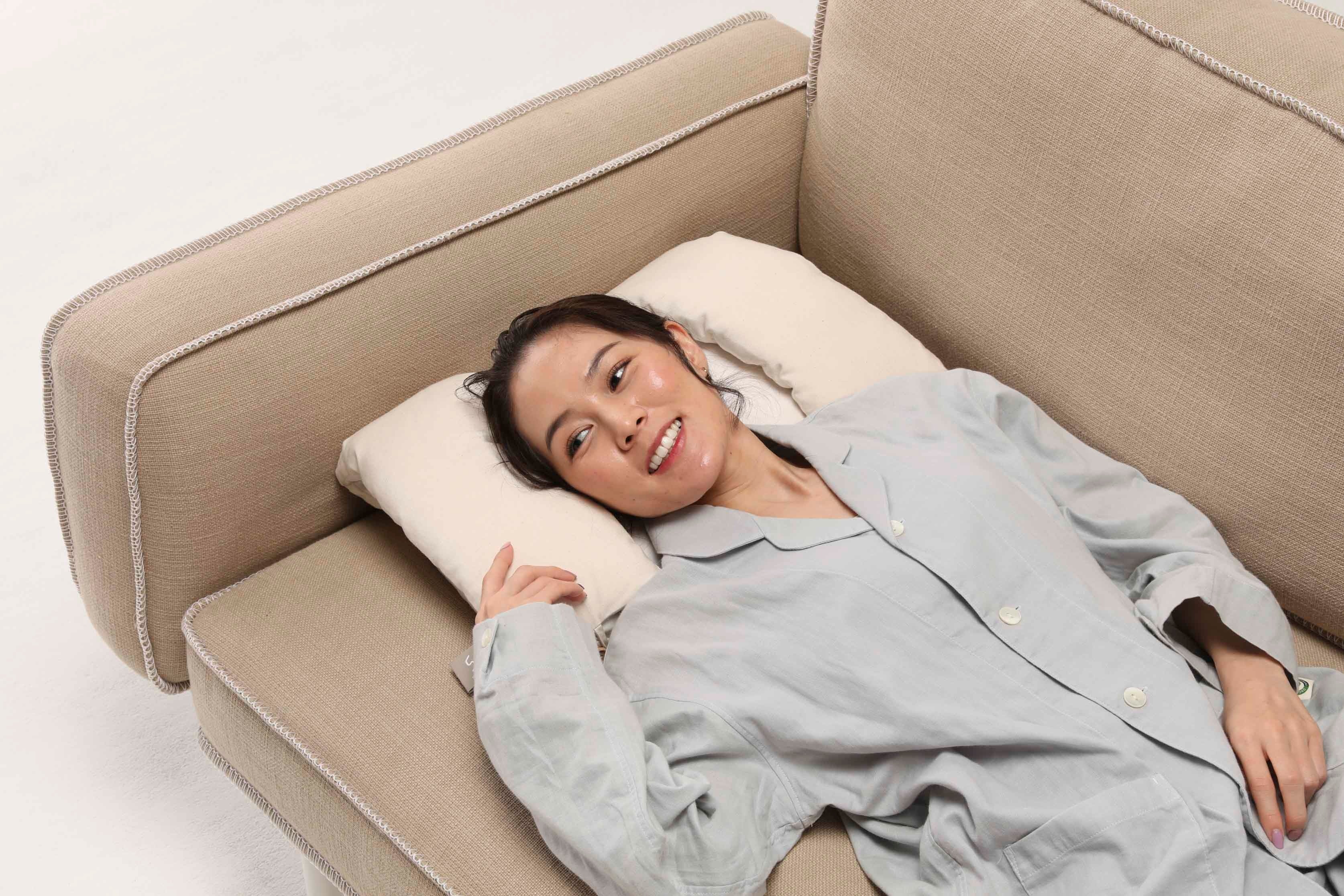 家での映画鑑賞や、ソファでくつろいでいるときに枕部分を頭に、耳部分を肩に垂らして使うと、まるで首に枕を巻いているような安心感に包まれます。ベッドでは、耳を枕にボタン留めして使うと頭が安定します。寝返りを打って体が横になっても高くなった頭を安定させてくれます。専用カバー生地には、オーガニックコットンを使っています。