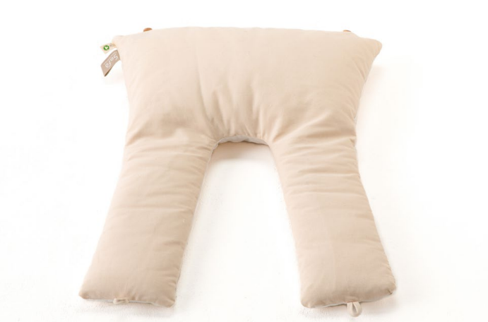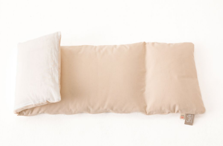 広げたままで使ったり、体が横になった時に枕の端を内側に折り込んで使うと頭が安定します。専用カバー生地には、オーガニックコットンを使っています。