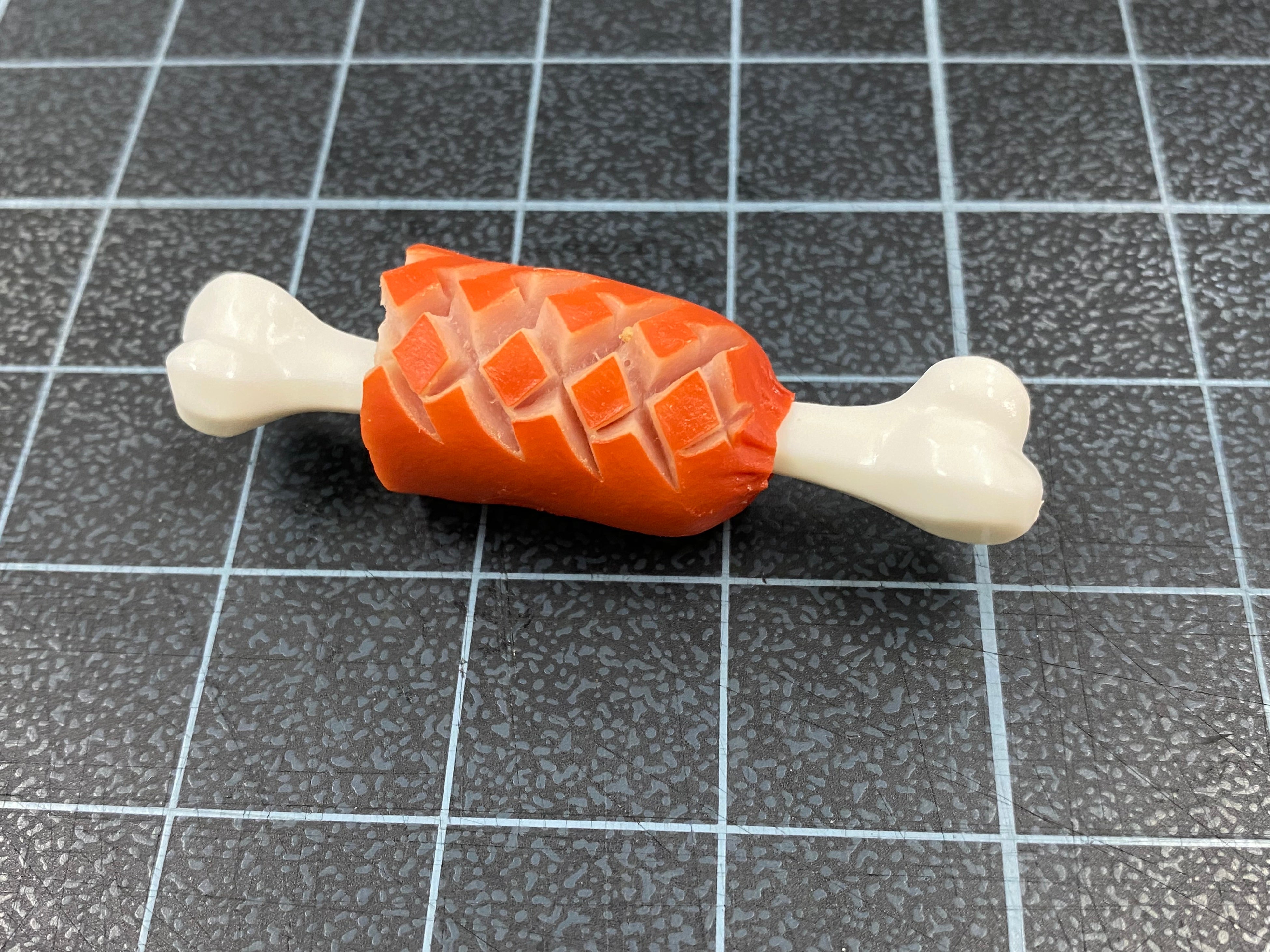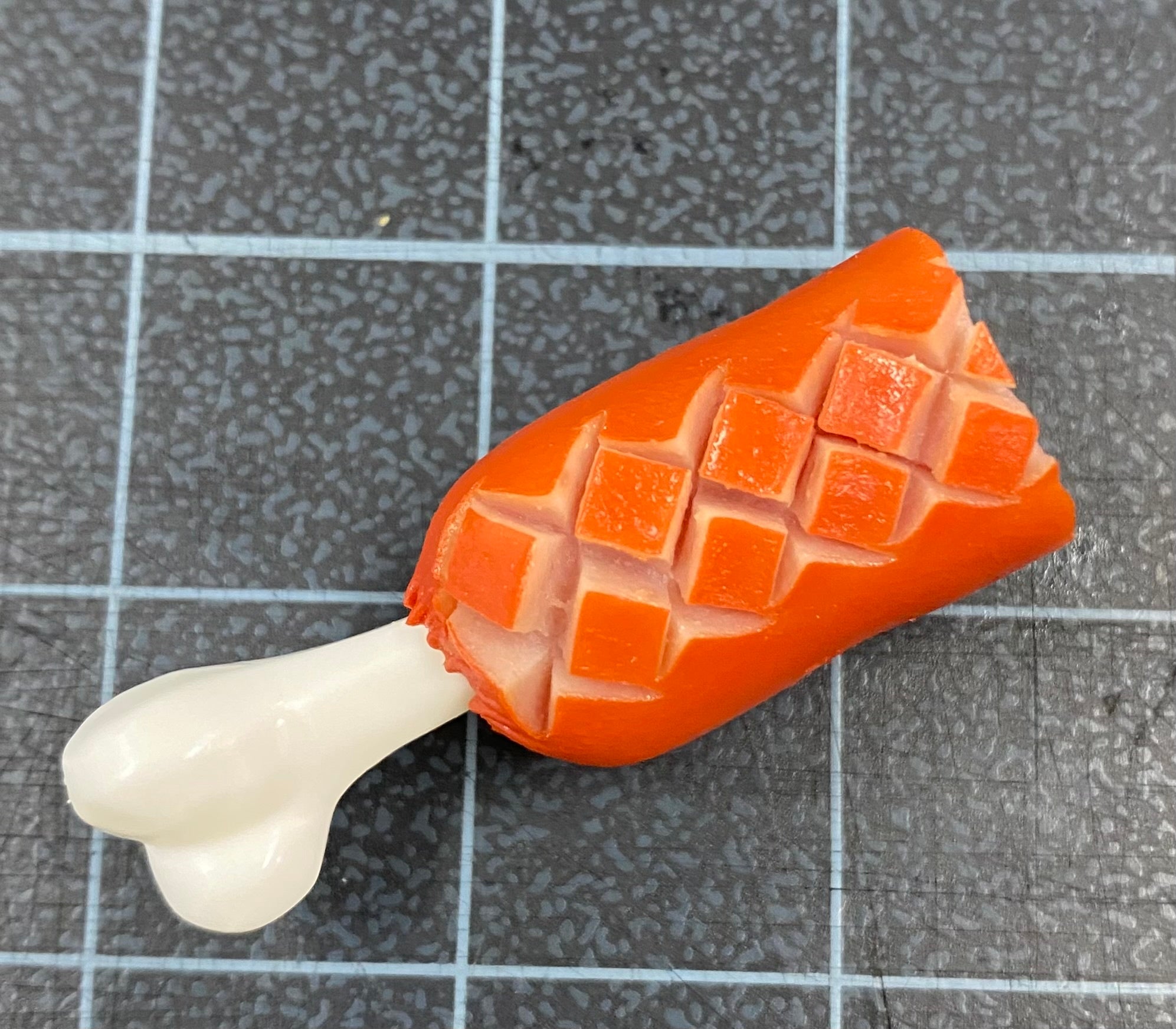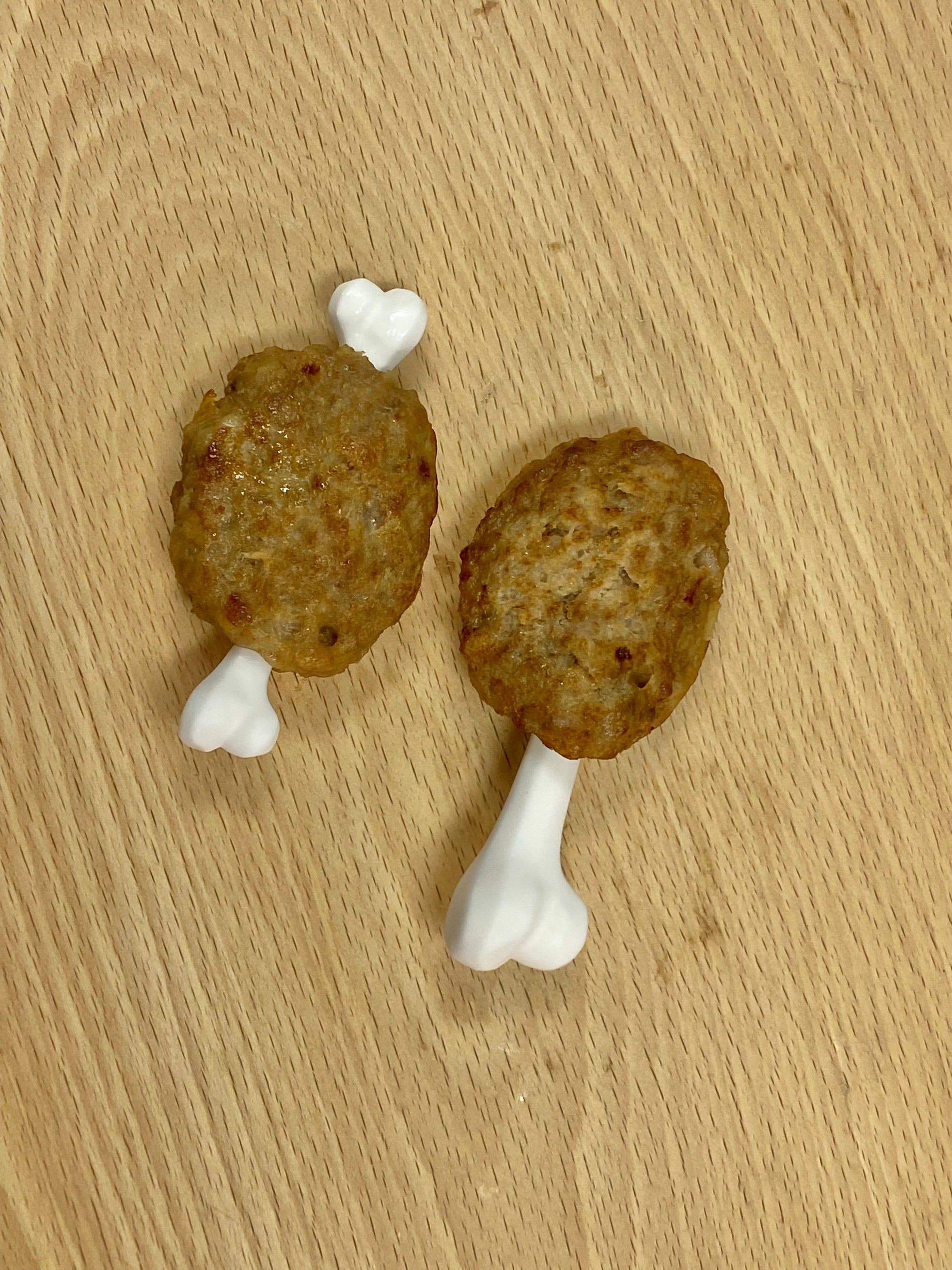 コヨーテやレッドフォックスなど端がハート型に見える動物たちの骨をモデルにした架空の生き物の骨という設定です。単純過ぎると実際の肉との違和感があり、リアル過ぎると不気味になってしまうので『現実にマンガ肉があったら』意識したデザインです。
