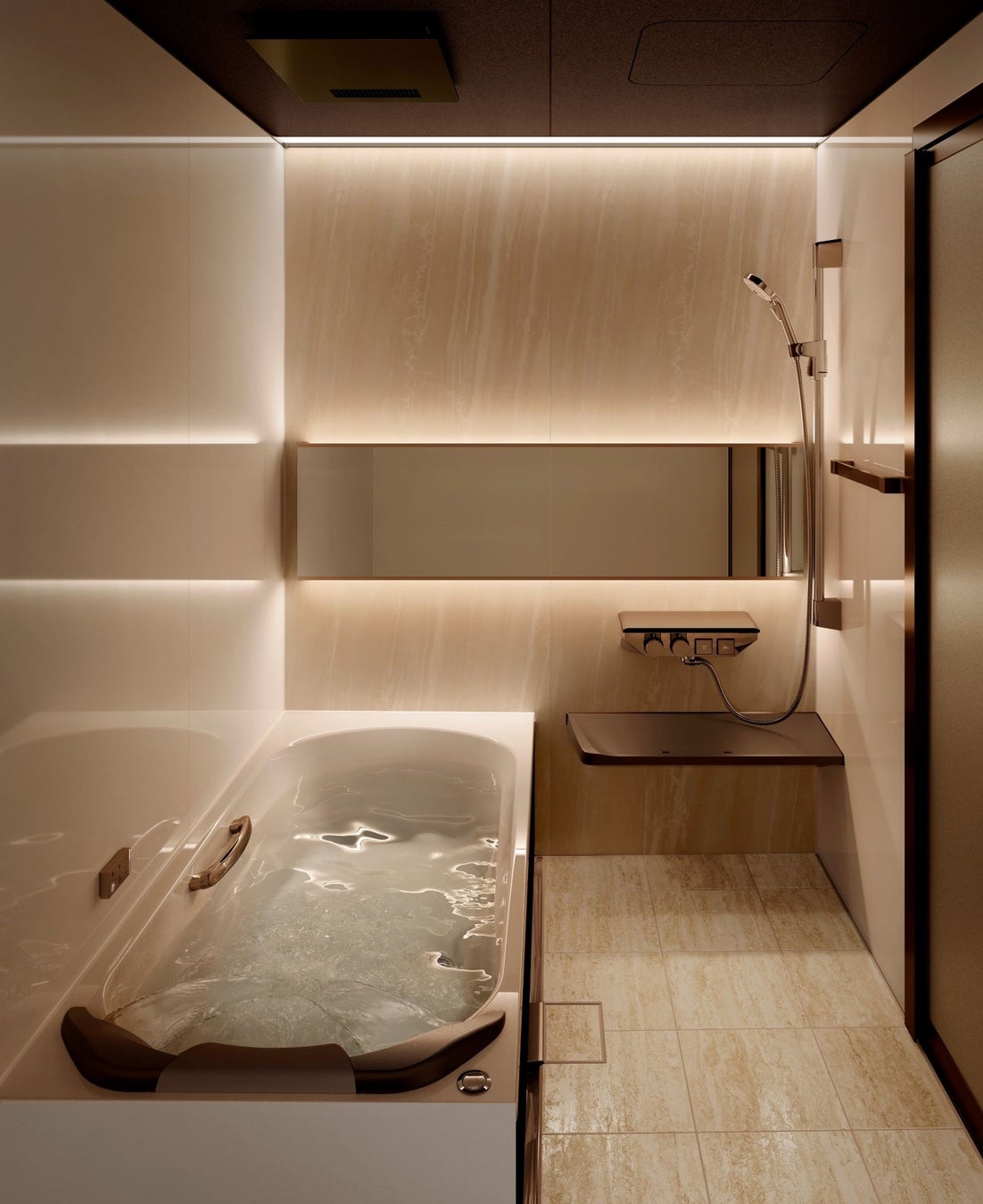 その他にも、マイクロバブルにより温泉気分を味わえる「うるぽか湯」、上質な癒し空間を演出する調光・調色機能付の間接照明がついた「ラグジュアリーミラー」、自動浴槽洗浄システム「オートウォッシュ」、デザイン性をより高めるカラー天井など、より快適で過ごしやすく、お手入れのしやすい浴室を作り上げていただけます。