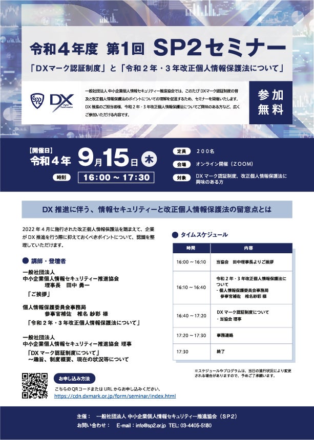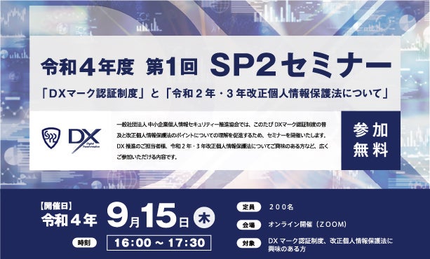 中小企業のDX化を推進するための「DXマーク認証制度」と「DXアドバイザー検定」を運営する一般社団法人中小企業個人情報セキュリティー推進協会(所在地:東京都新宿区、以下 当協会)は、「DXマーク認証制度」の普及と、「令和2年・3年改正個人情報保護法」についての理解促進を目的として、2022年9月15日(木)16:00〜「令和4年度 第1回 SP2セミナー」をオンラインにて開催いたします。
