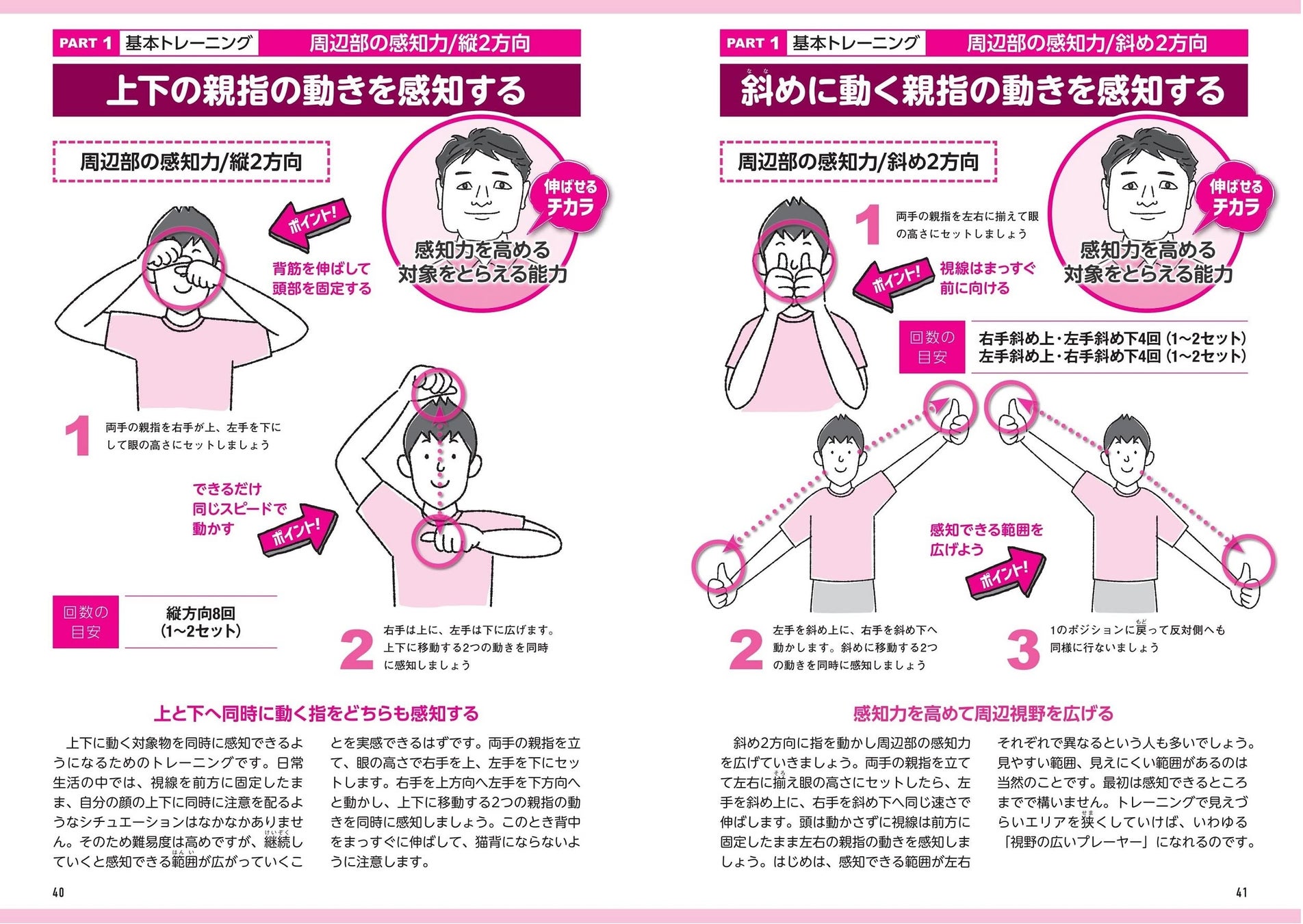 基本では、動体視力や眼球運動など、基本的な視覚能力を高めるトレーニングを紹介しています。トレーニング内容も簡単なので継続してトレーニングをすることで必ずできるようになります。応用では、基本で身につけた視覚能力を使いこなしていくことを目指します。ビジョントレーニングは段階的にステップアップしていくことで、視覚や思考と身体機能の結びつきが高まります。プレーにおける鋭い着眼点や深い思考能力を養っていくことができます。
