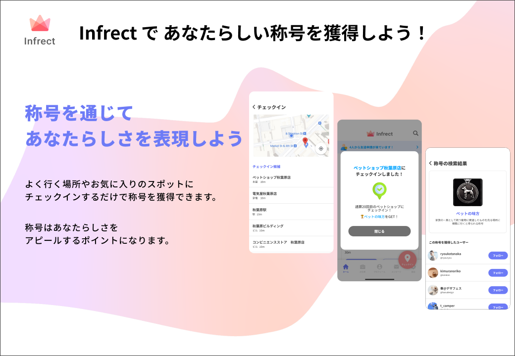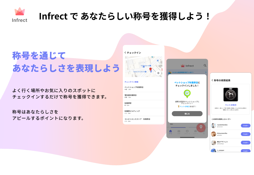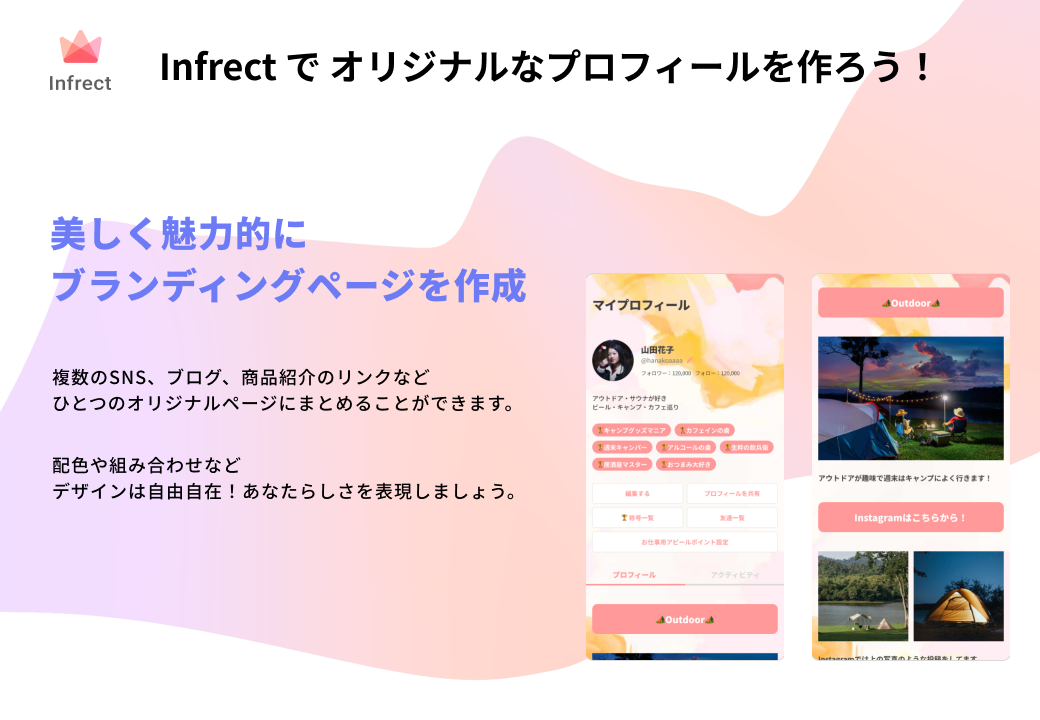 「INFRECT」では自分の写真・SNS、チェックインで獲得できる称号などを用いて、オリジナルのブランディングページを作成できます。