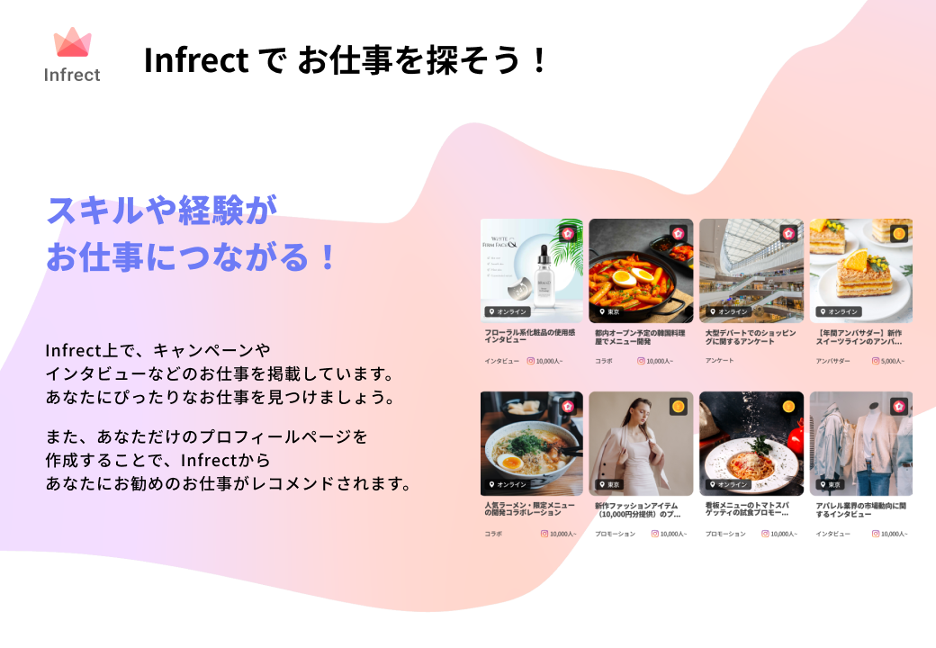 株式会社INFRECT(本社 : 東京都千代田神田和泉町1-12-15 代表取締役 : 赤谷 翔太郎)はプロフィール作成&お仕事マッチングサービス「Infrect」をローンチしました。
