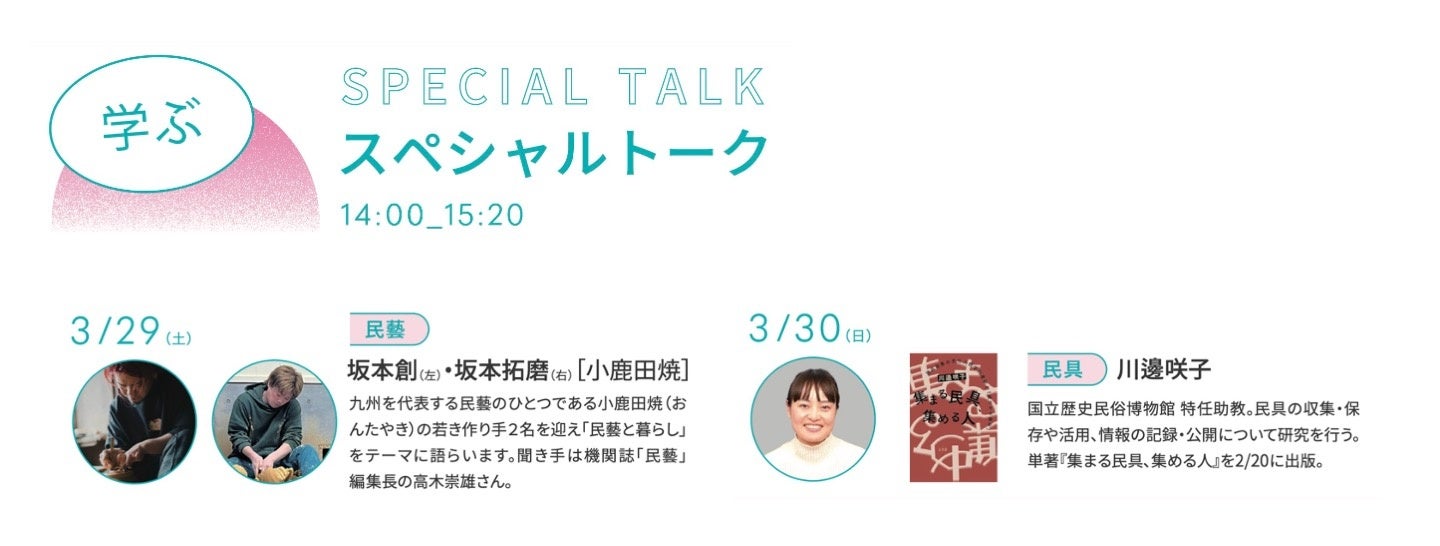 「民藝」と「民具」。2つの世界をより深く楽しむために、日替わりで特別ゲストをお迎えしてお届けするスペシャルトークを実施します。観覧無料。