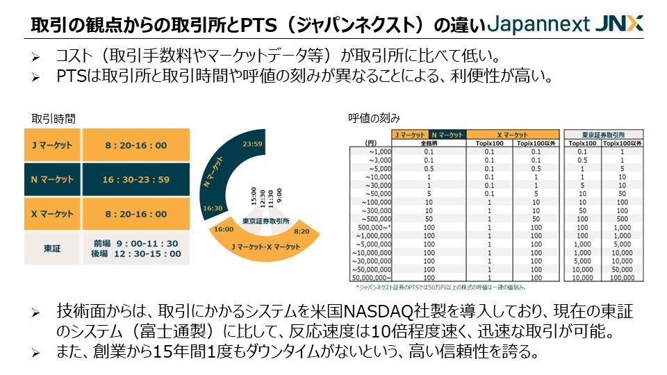 ジャパンネクスト証券(以下、JNX証券)山田CEOはPTSの成り立ちから現状について、「1998年に日本版ビッグバンが起こってルールが廃止され、それまで禁止されていた取引所以外での上場株式の取引が実質上解禁された。PTSの機能は取引所と同様で、株式等の売買取引が可能。現在、日本ではJNX証券、Cboeジャパン、大阪デジタルエクスチェンジがPTSを運営しており、3社合わせて国内シェアは約10%超という状況だ」と説明。取引時間や呼値の刻みが東証と異なることによって、利用者の利便性を高めていることにも言及しました。